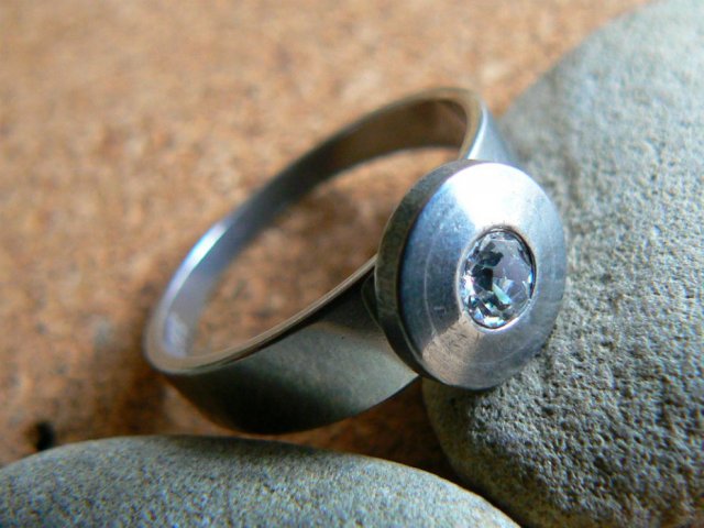 Delikatny pierścionek w nowoczesnym stylu. Wykonany z nierdzewnej stali szlachetnej, pokryty srebrem 925 (wybita próba). Lekko oksydowany i satynowany, dzięki czemu ma szlachetny ciemno srebrny kolor i zachował mat.