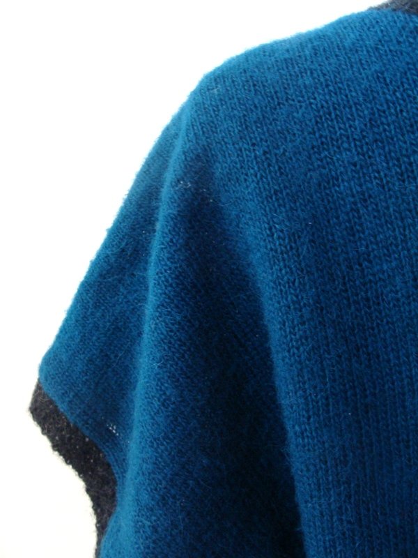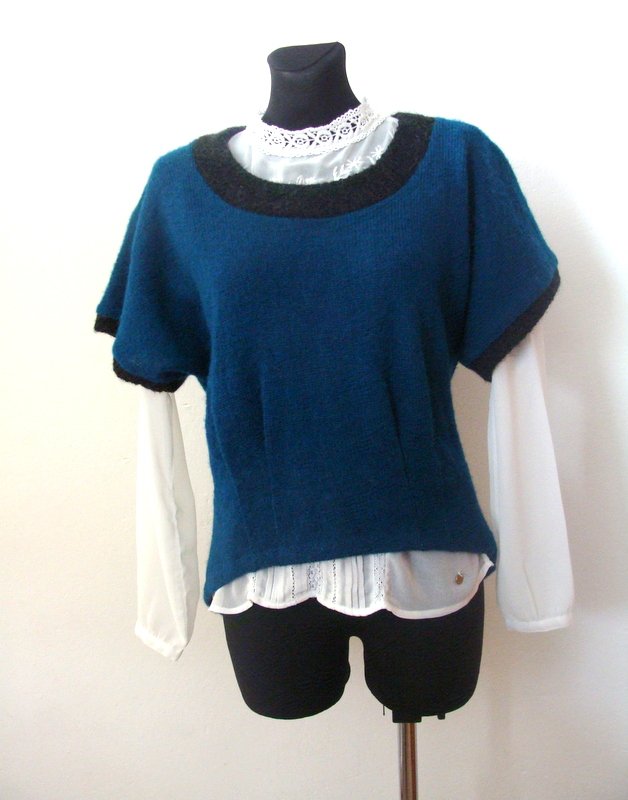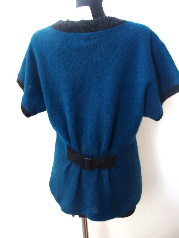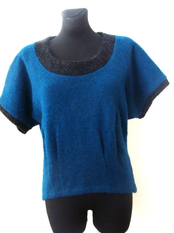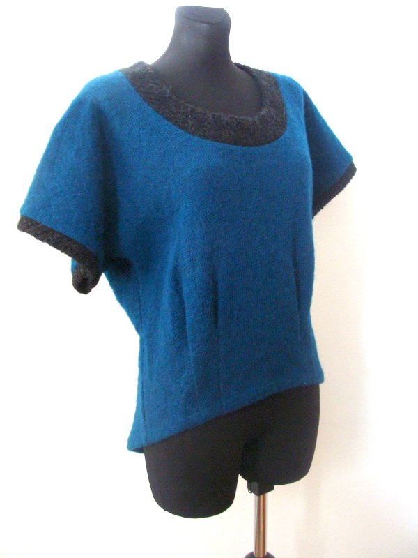 Asymetryczny wełniany sweter w morskim kolorze z ciemnoszarymi dodatkami wykończeniowymi. Rękawy o fasonie nietoperza bez szwów ramiennych. Przód z łukowatym podkrojem u dołu z z dwiema płytkimi zakładkami, tył dłuższy zaokrąglony dołem, z talią podkreśloną czterema małymi kontrafałdkami z naszytą patką z klamerką,