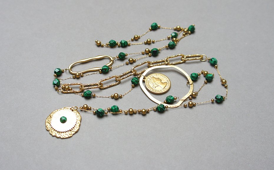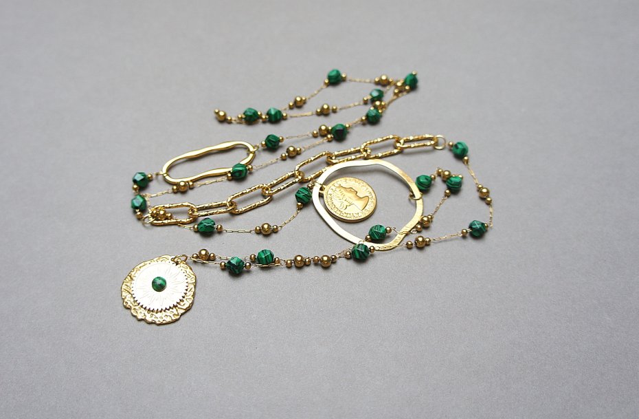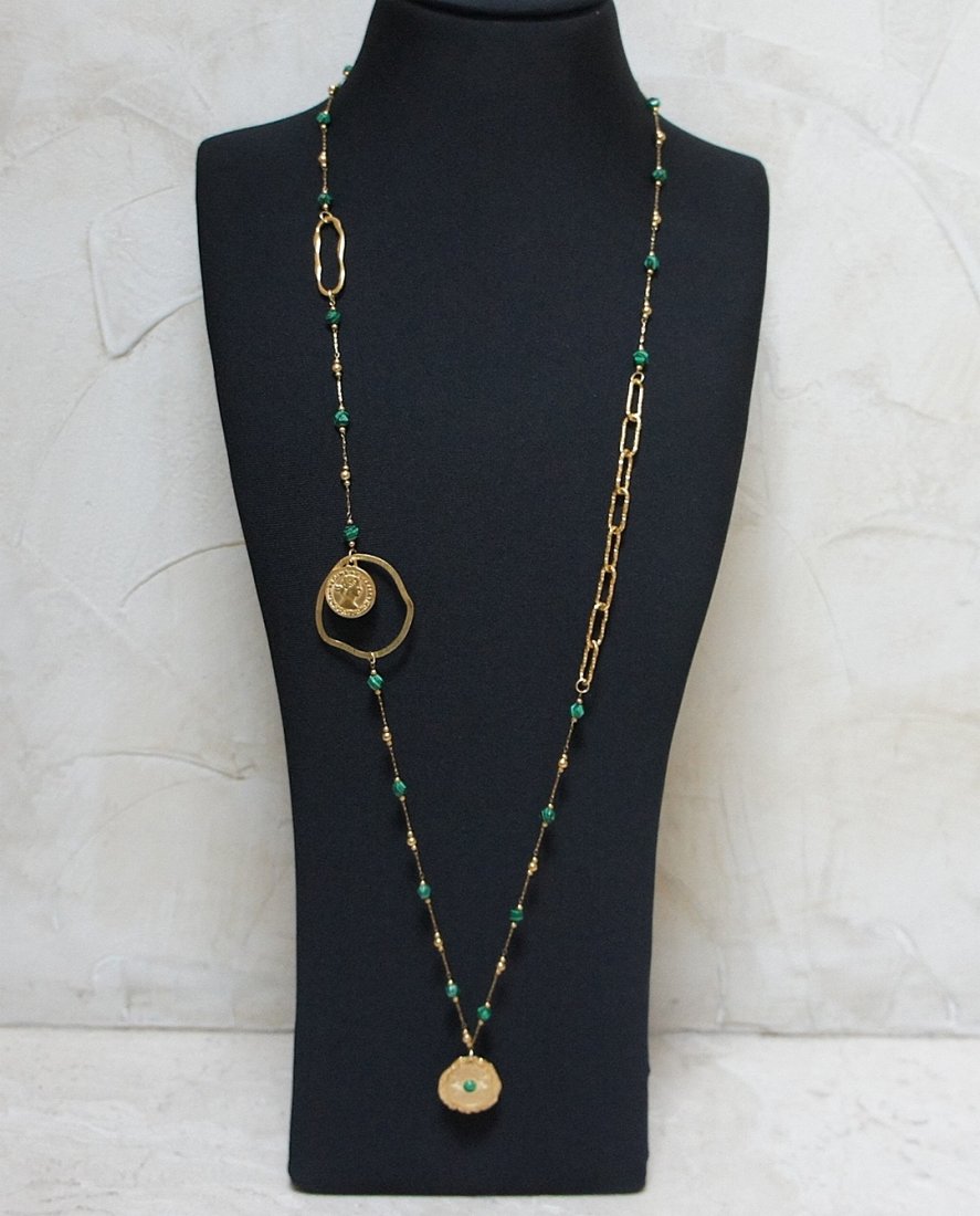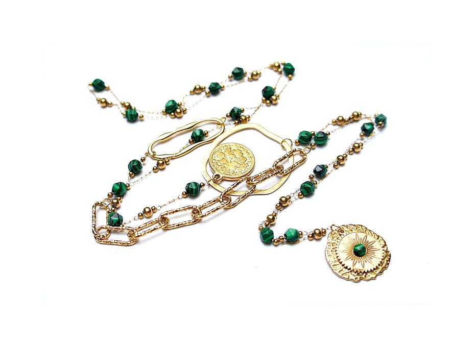 Bardzo długi naszyjnik wykonany ze stali szlachetnej pozłacanej w połączeniu z naturalnymi ciosanymi malachitami - [ok 6mm], zawieszki z naturalnym kamieniem, nieregularnej obręczy z mosiądzu. Całkowita długość naszyjnika ok. 99 cm. Biżuteria ozdobnie zapakowana.
