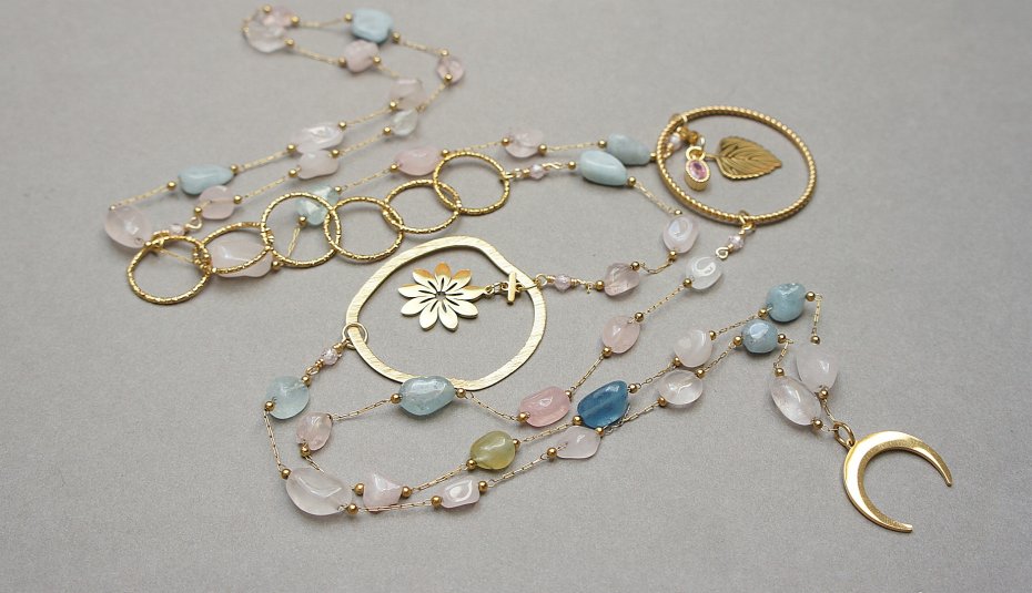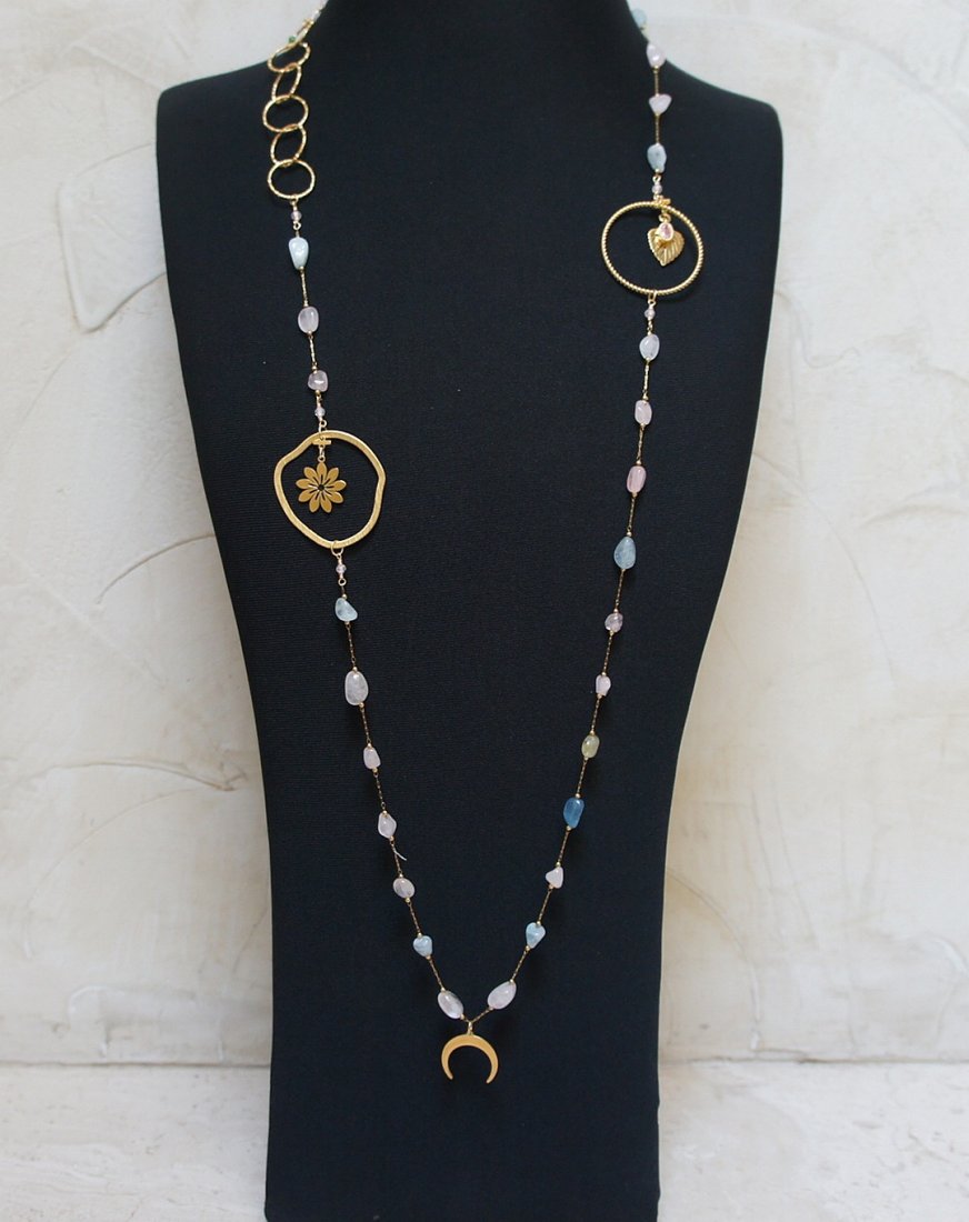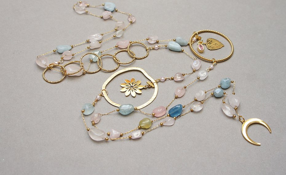 Bardzo długi naszyjnik wykonany ze stali szlachetnej pozłacanej w połączeniu z naturalnymi minerałami - pastelowy morganit [od 6mm do 11mm] oraz zawieszki z cyrkonią w okuciu. Całkowita długość naszyjnika ok. 110 cm. Biżuteria ozdobnie zapakowana.
