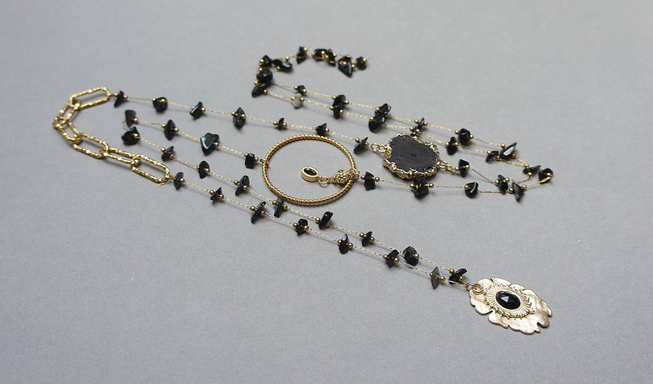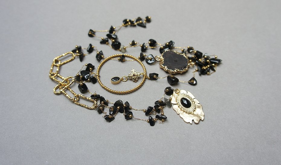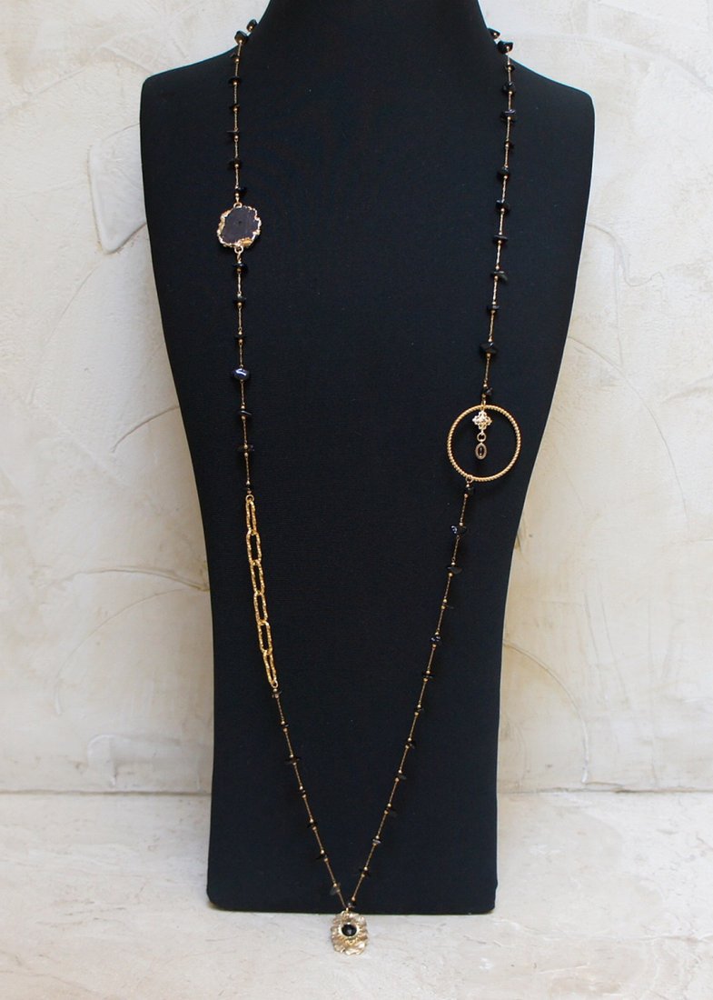 Bardzo długi naszyjnik wykonany ze stali szlachetnej pozłacanej w połączeniu z naturalnym onyksem - [od ok 4mm do 11mm], łącznika z agatu, zawieszki z naturalnym kamieniem, zawieszki z cyrkonią w okuciu, łącznika z platerowanego mosiądzu z cyrkonią, nieregularnej, matowej blaszki z mosiądzu platerowanego. Całkowita długość naszyjnika ok. 108 cm. Biżuteria ozdobnie zapakowana.