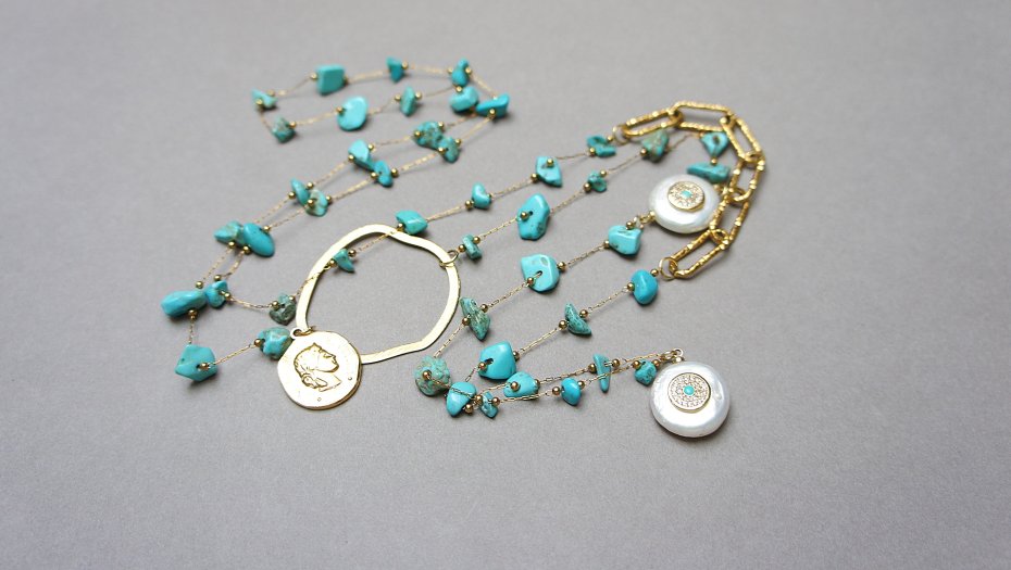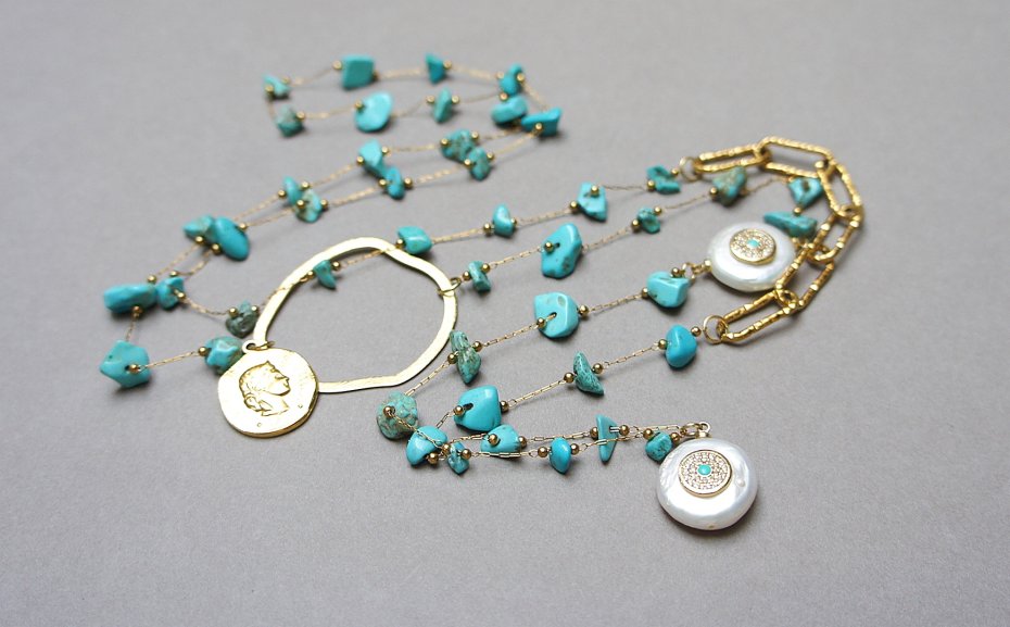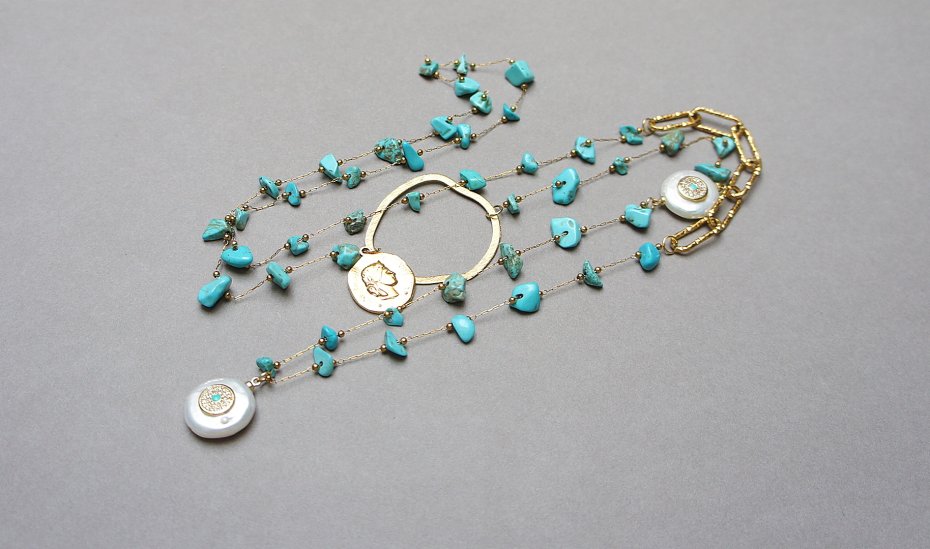 Bardzo długi naszyjnik wykonany ze stali szlachetnej pozłacanej w połączeniu z naturalnymi turkusami - [od ok 6mm do 11mm], łącznika i zawieszki z dużą monetką naturalnej, słodkowodnej perły z umieszczonym po środku emblematem wysadzanym cyrkoniami i naturalnym kamieniem, nieregularnej obręczy z mosiądzu. Całkowita długość naszyjnika ok. 100 cm. Jedyny egzemplarz. Biżuteria ozdobnie zapakowana.