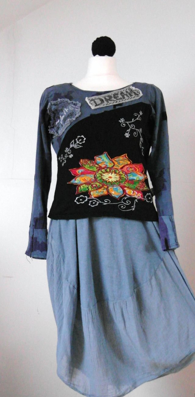 Naszyte aplikacje, hafty, printy i widoczne szwy przy mankietach. Oryginalna, wesoła, niepowtarzalna.Na plecach też kwiaty. Dosyć krótka.