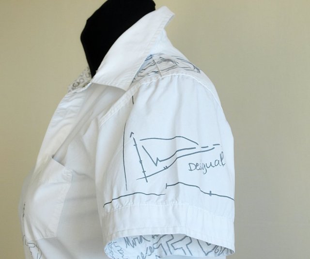 Koszulka z białej sztywniejszej bawełny z nadrukami. Koszulka jest chłopięca na 12 lat, fason prosty, ale doskonale pasuje na rozmiar 36. Podaję wymiary mierzone na płasko;