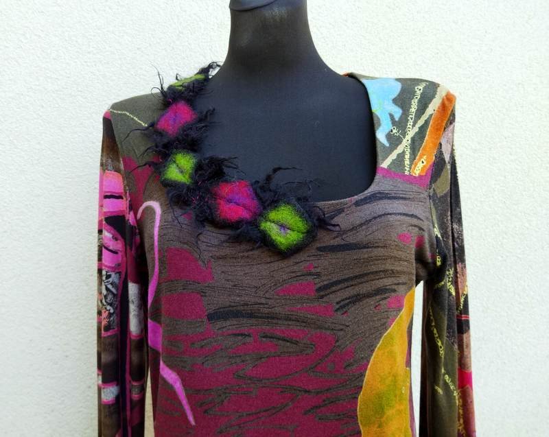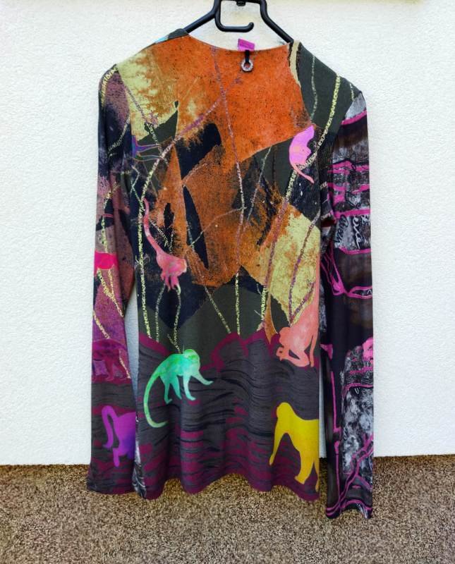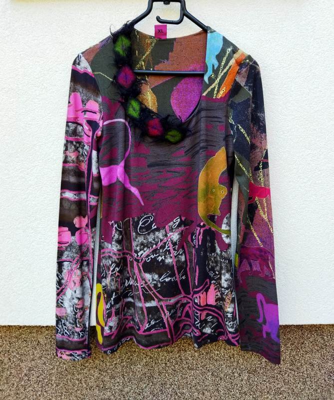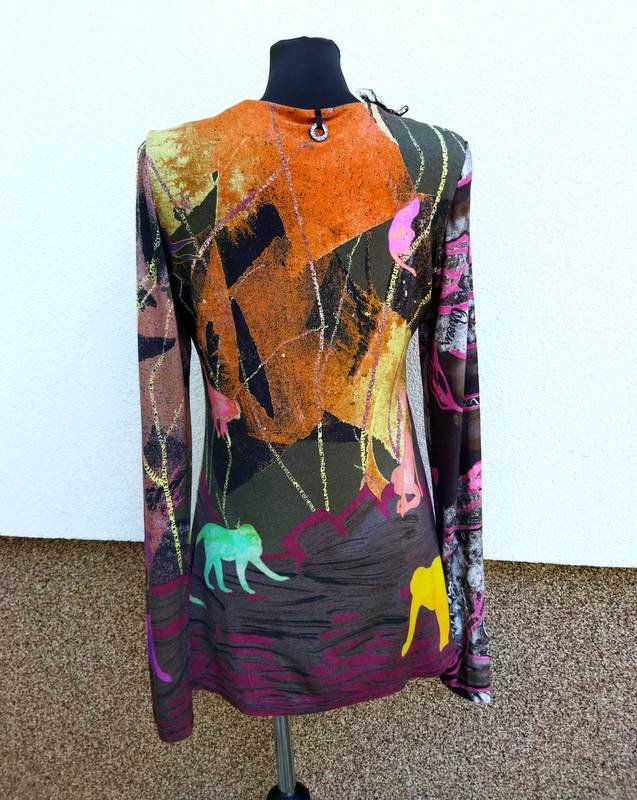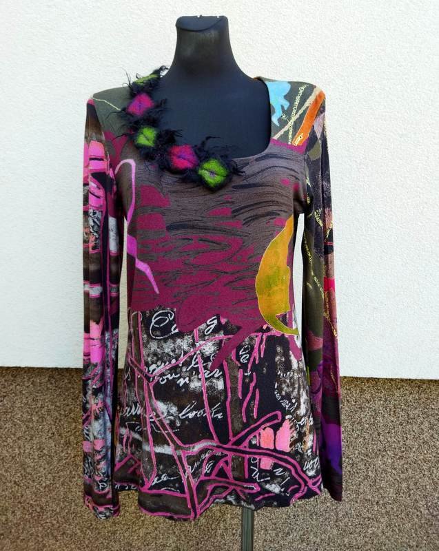 Fantastyczna bluzka z wiskozy i nylonu z ciekawymi nadrukami i piękną kolorystyką. Owalny dekolt zdobiony z jednego boku naszywaną aplikacją . Na podszewce z cienkiej rozciągliwej siateczkowej tkaniny. Miła , podatna i rozciągliwa