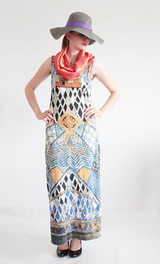 Niezwykła sukienka maxi włoskiej marki Save The Queen. Wykonana z elastycznej tkaniny.