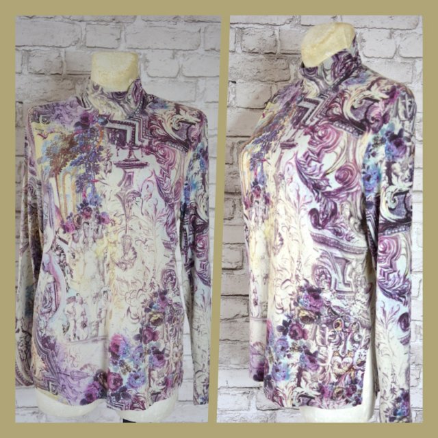 Świetna bluzka z golfem w jasnych pastelowych kolorach w grafikę typu sceny biblijne , bluzka wykonana z przyjemnej elastycznej tkaniny. U dołu po bokach posiada krótkie rozcięcia.
