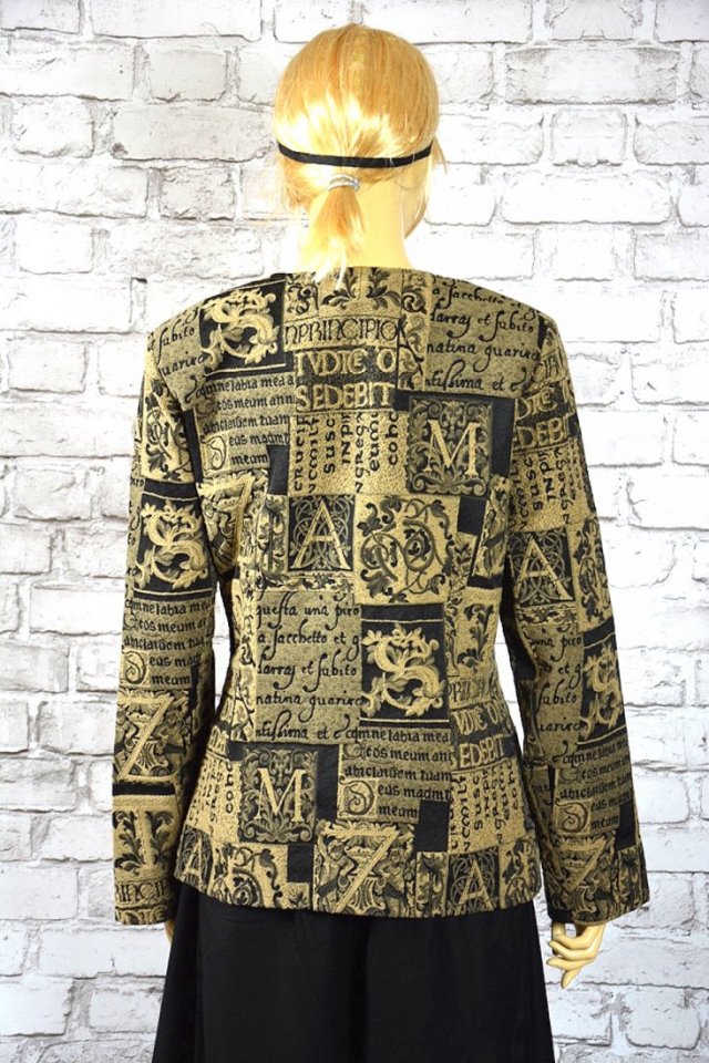 Unikatowa gobelinowa kurtka/żakiet w rustykalnym stylu we wzory min postaci( sceny biblijne) , prawdopodobnie łacińskie napisy itp, wzory są delikatnie wypukłe, żakiet wykonany z gobelinowej,ładnie trzymającej fason tkaniny, zapinany na guziki.Fason -deliaktnie taliowany.