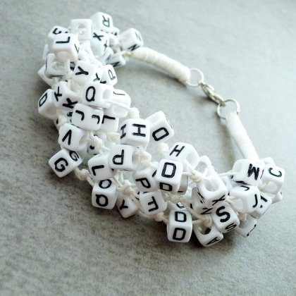 lekka bransoletka wykonana z kwadratowych koralików z wytłoczonymi literkami umieszczonymi na białych, lnianych sznurkach waga: 14g, długość: 19-21 cm