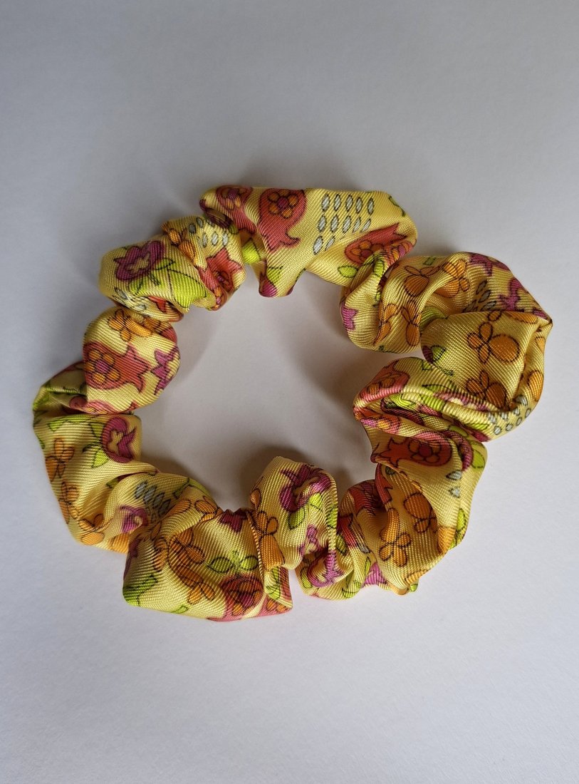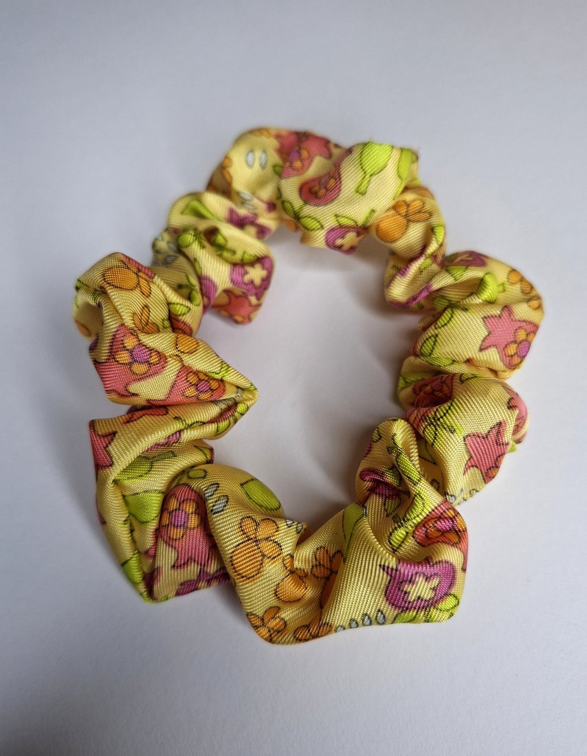 Ta gumka to nie jest zwykłe akcesorium. To mały manifest ekologii i dowód na to, że kreatywny recycling może być niezwykle stylowy. Wykonałam ją ze skrawka materiału o pięknym, satynowym połysku, który mieni się w słońcu na złoto i żółto. Materiał zdobi gęsty, kolorowy wzór w kwiaty i listki, co nadaje jej radosnego charakteru. Materiał pochodzi z moich zapasów tkanin z "drugiej ręki" – to unikat, którego nie znajdziesz w żadnej sieciówce!