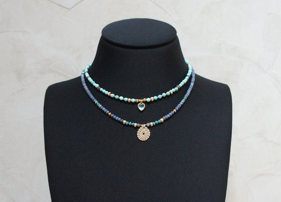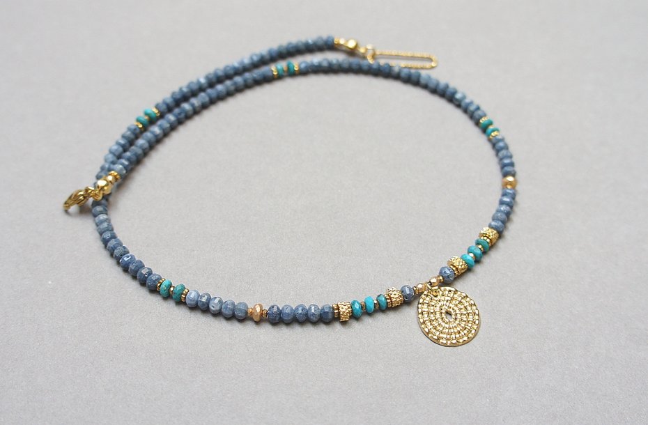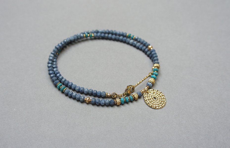 Krótki, delikatny naszyjnik wykonany w całości z pozłacanej stali szlachetnej, naturalnego niebieskiego korala fasetowanego [3 x 2mm], oponek fasetowanego naturalnego turkusu [3 x 2mm], hematytu fasetowanego, platerowanego o matowej powłoce [3 x 2mm], przekładek z hematytu [1mm], Naszyjnik o długości ok. 43cm. Biżuteria ozdobnie zapakowana.
