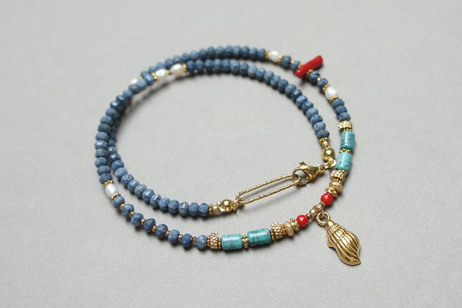 Krótki, delikatny naszyjnik wykonany w całości z pozłacanej stali szlachetnej, naturalnego niebieskiego korala fasetowanego [3 x 2mm], wałeczków naturalnego turkusu [6mm], pereł słodkowodnych [4mm], czerwonego, fasetowanego koralu [3mm], patyczki z czerwonego koralu, hematytu fasetowanego, platerowanego o matowej powłoce [4 x 2mm; 2mm], przekładek z hematytu [1mm], Naszyjnik o długości ok. 42cm. Biżuteria ozdobnie zapakowana.