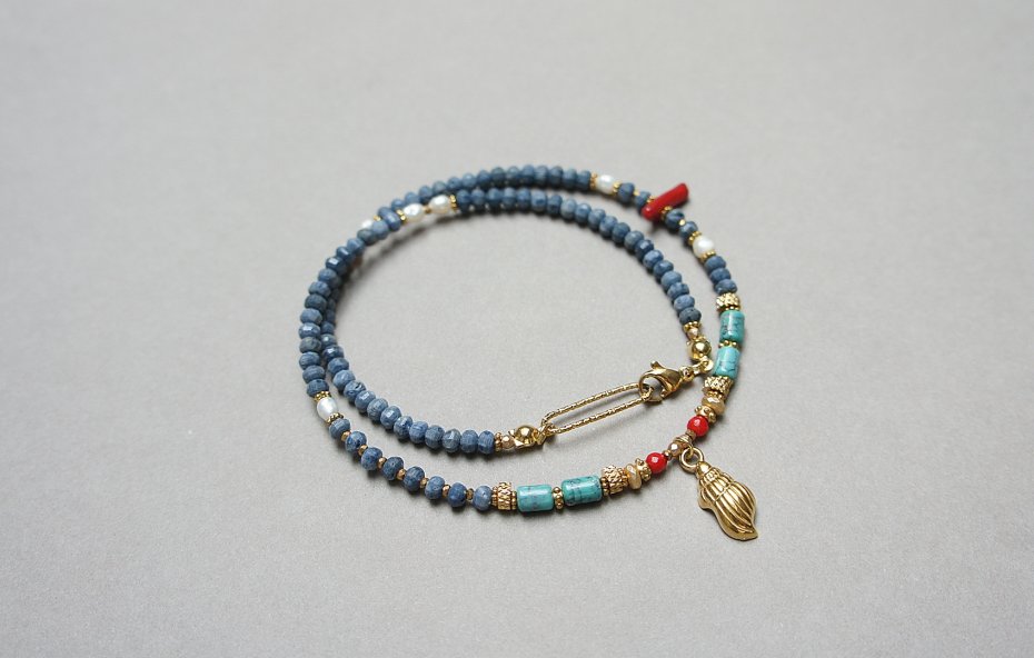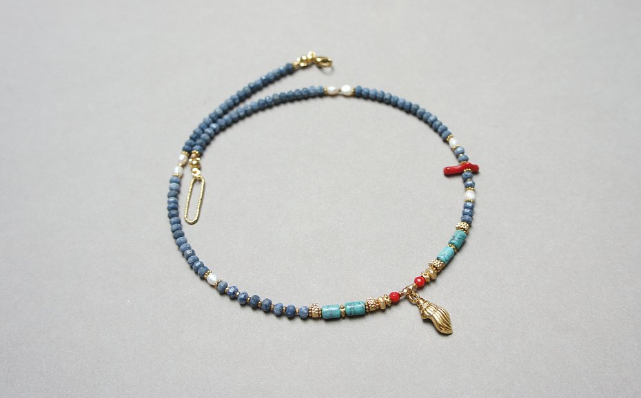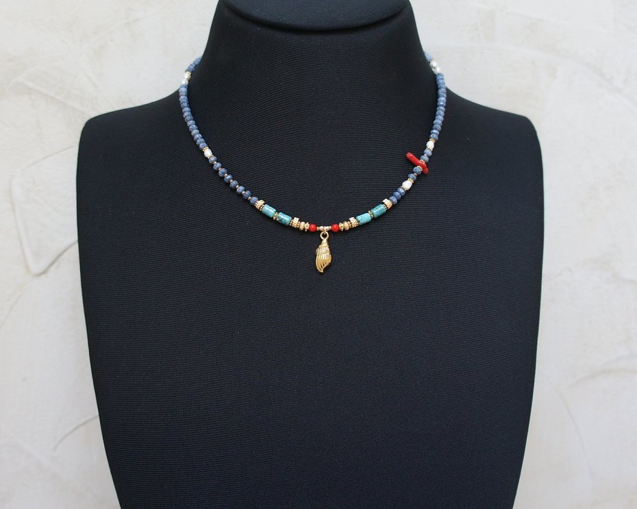 Krótki, delikatny naszyjnik wykonany w całości z pozłacanej stali szlachetnej, naturalnego niebieskiego korala fasetowanego [3 x 2mm], wałeczków naturalnego turkusu [6mm], pereł słodkowodnych [4mm], czerwonego, fasetowanego koralu [3mm], patyczki z czerwonego koralu, hematytu fasetowanego, platerowanego o matowej powłoce [4 x 2mm; 2mm], przekładek z hematytu [1mm], Naszyjnik o długości ok. 42cm. Biżuteria ozdobnie zapakowana.