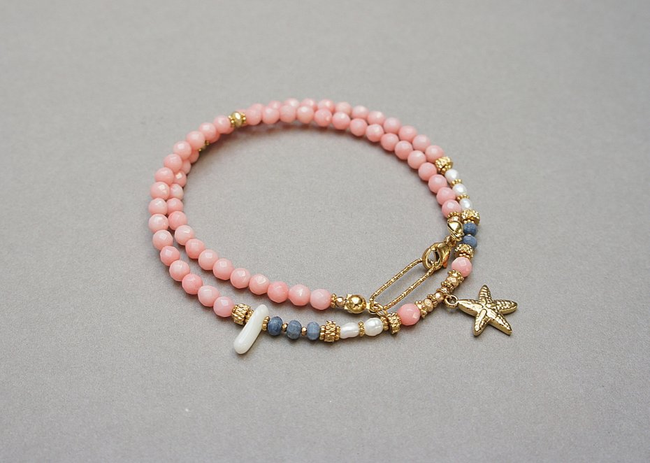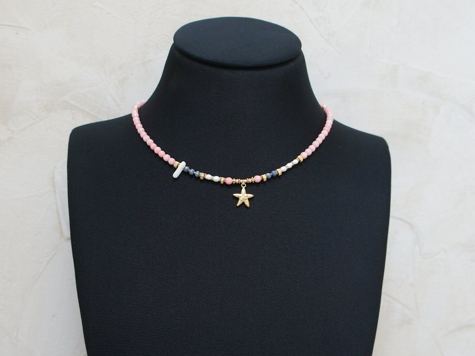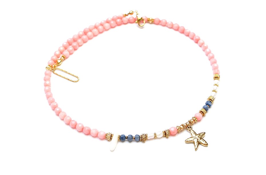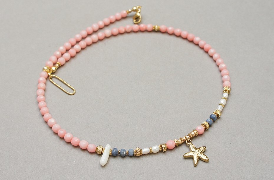 Krótki, delikatny naszyjnik wykonany w całości z pozłacanej stali szlachetnej, naturalnego różowego korala fasetowanego [4mm], oponek niebieskiego korala [3x2mm], pereł słodkowodnych [6mm], hematytu fasetowanego, platerowanego o matowej powłoce [4x2mm, 3x2mm oraz 2mm], nieregularnego, białego korala w kształcie patyczka, przekładek z hematytu [1mm]. Naszyjnik o długości ok. 43cm. Biżuteria ozdobnie zapakowana.