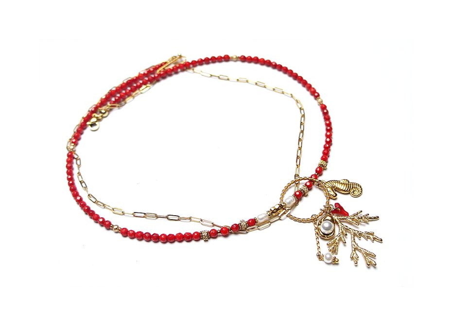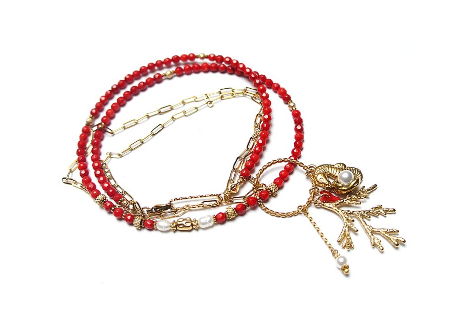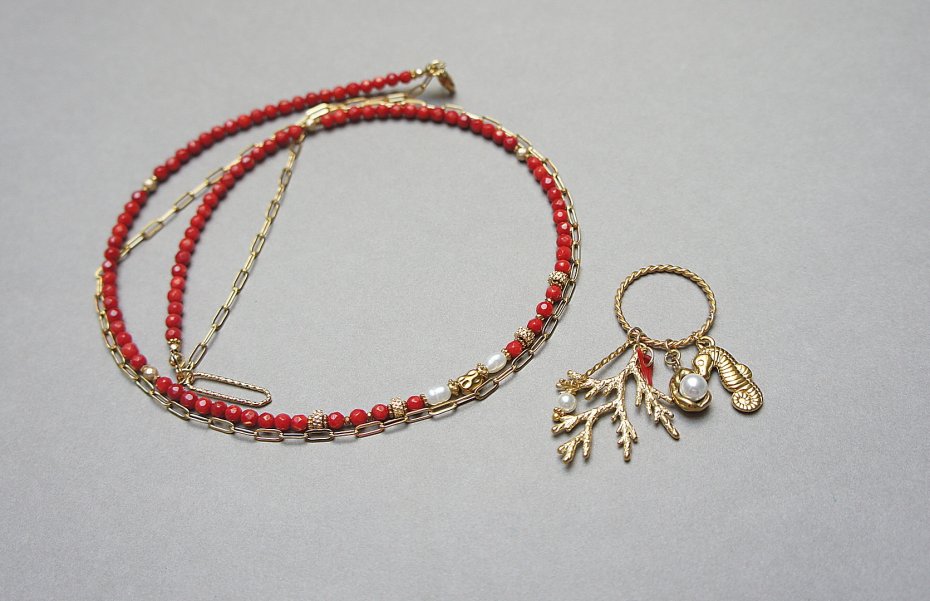 Krótki, delikatny naszyjnik wykonany w całości z pozłacanej stali szlachetnej, naturalnego czerwonego koral fasetowanego [4mm], hematytu fasetowany, platerowanego o matowej powłoce [3mm], pereł słodkowodnych [ok. 6-7mm], przekładek z hematytu [1mm], zawieszki z naturalnej perły [śr. 12mm], zawieszki z naturalnego, czerwonego korala. Naszyjnik o długości 48cm. Biżuteria ozdobnie zapakowana.