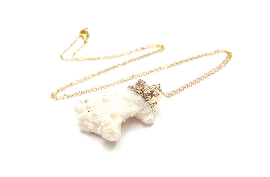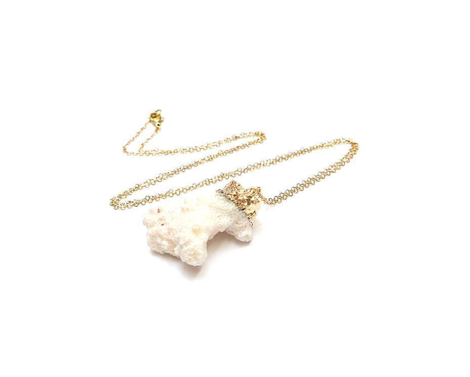 Długi, delikatny naszyjnik wykonany z pozłacanej stali szlachetnej oraz bryłki białego korala [ok 4,5 x 3,2cm]. Naszyjnik o długości ok. 72cm. Biżuteria ozdobnie zapakowana.