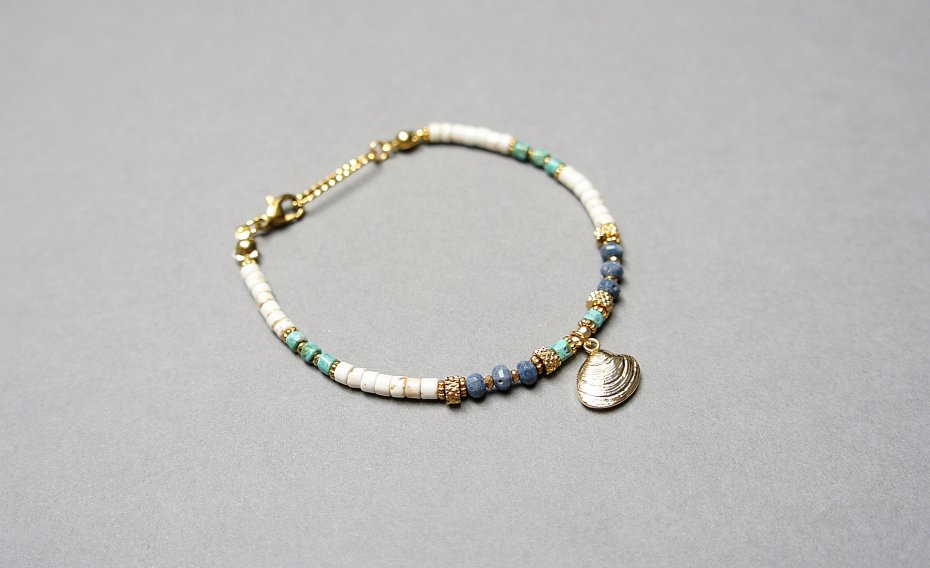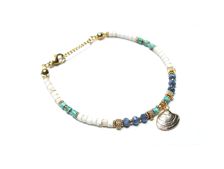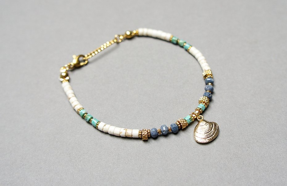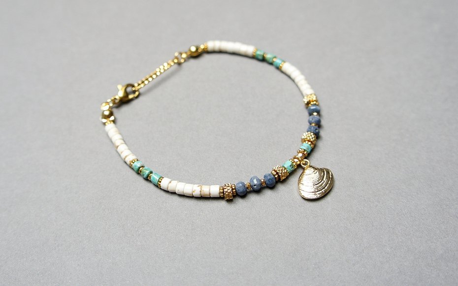 Bransoletka wykonana w całości z pozłacanej stali szlachetnej oraz naturalnych kamieni - oponki niebieskiego korala [ok. 2,5 x 4mm], talarków naturalnego turkusu [3 x 2mm], talarków howlit [3 x 2mm], przekładek z hematytu [1mm]. Całkowita długość bransoletki 18,8cm. Biżuteria ozdobnie zapakowana.