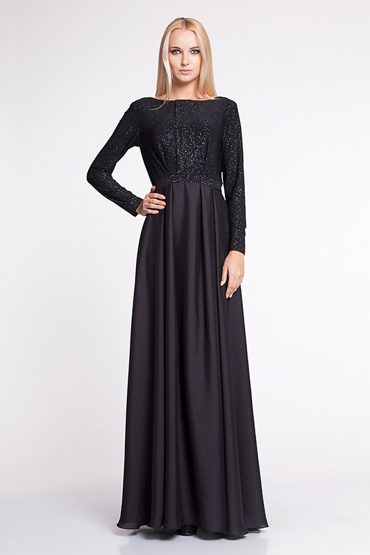Sukienka z odcięciem w talii, góra uszyta z dzianiny obsypanej brokatem. Ozdobna listwa i zakładki na przodzie, tył z zalotnym dekoltem, długi rękaw. Dół z pięknego szyfonu ułożony w zakładki, niezwykle lekki w ruchu. Całość na podszewce, zamek kryty z tyłu. Egzemplarz pojedynczy, polecam w bardzo okazyjnej cenie!