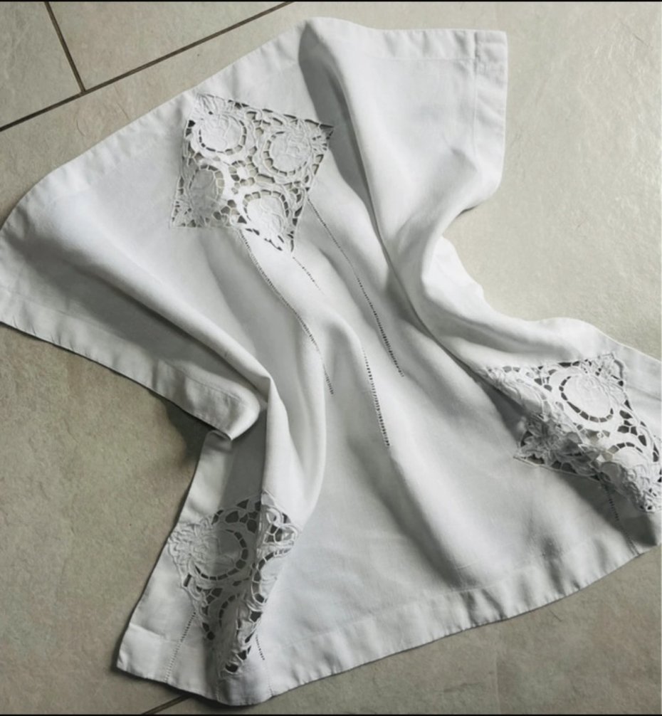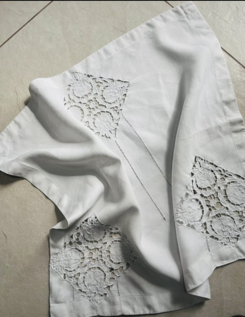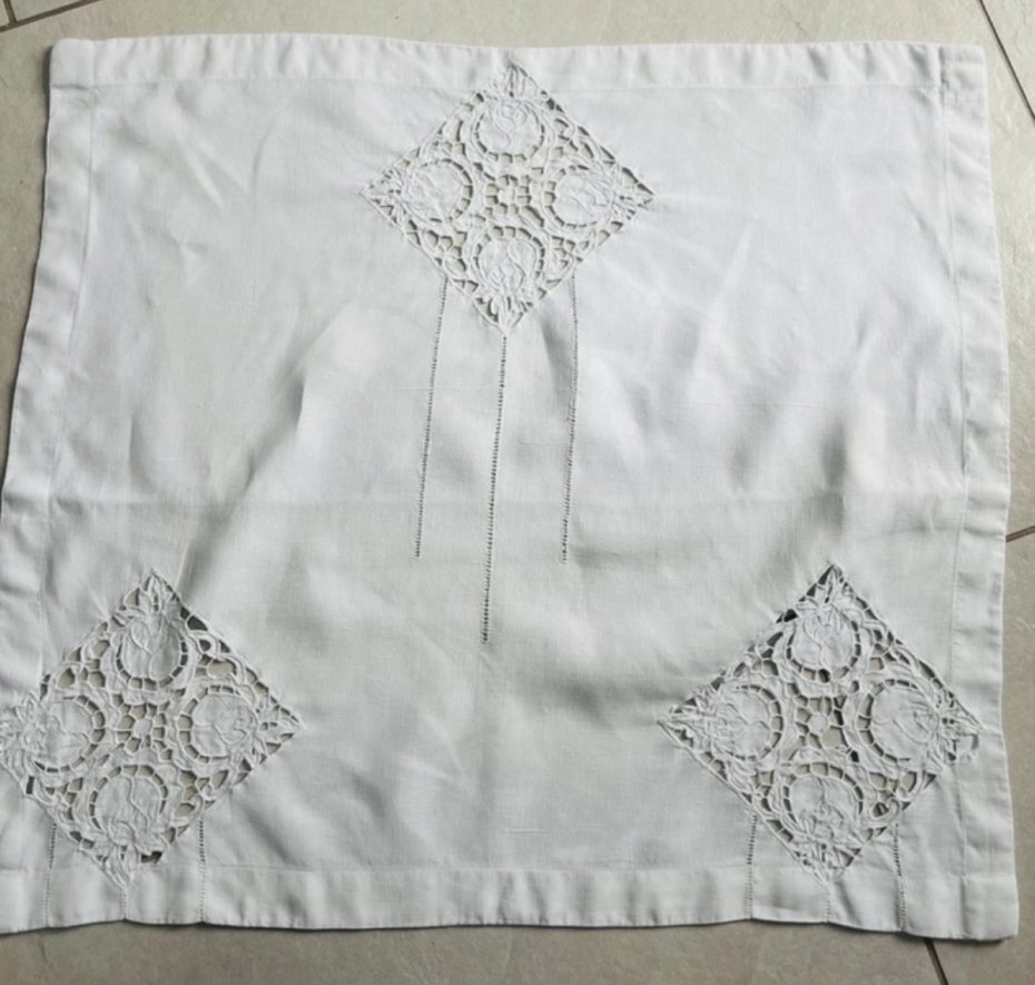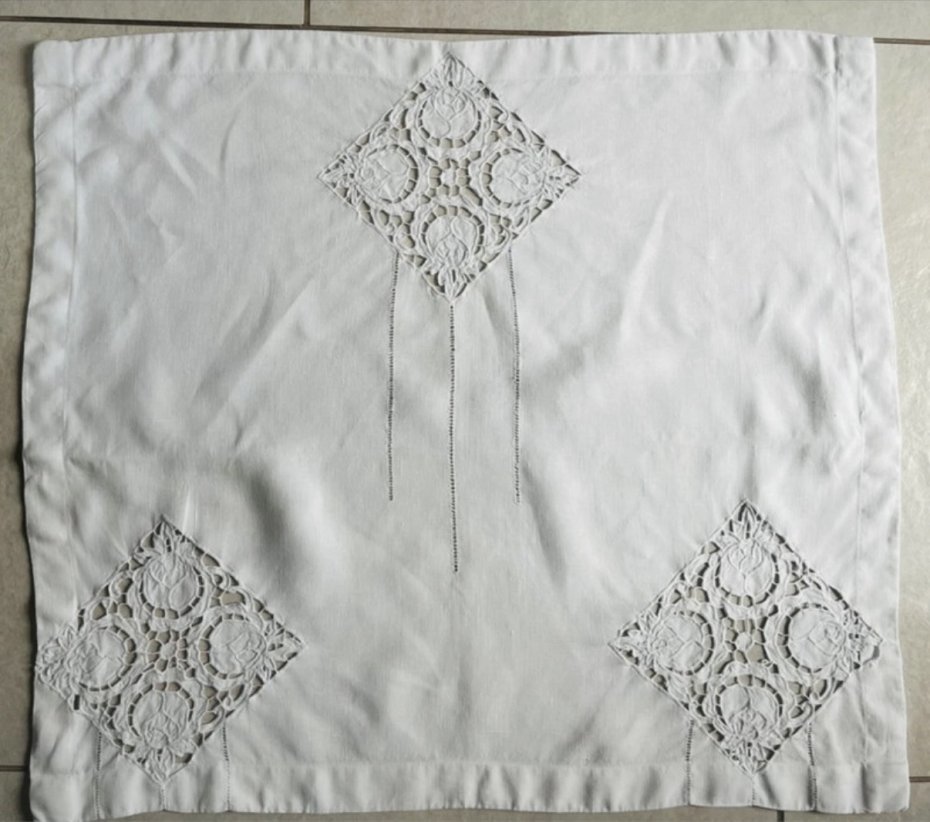 Pięknie haftowana z delikatnego płótna ręcznie szyta i serweta/obrus w idealnym stanie - biała - wym 70x65 , ręcznie haftowana haftem richelieu, wzór typowy dla wzorów secesyjnych