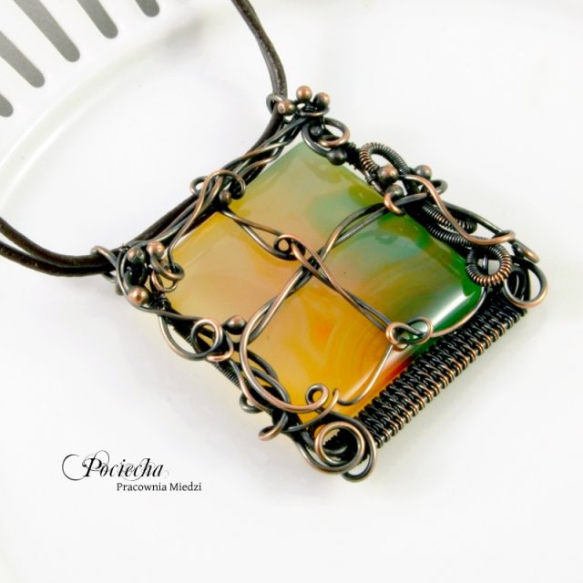 Wisior w formie okna ozdobiony pięknym agatem pawim w kolorach pomarańczu i zieleni.