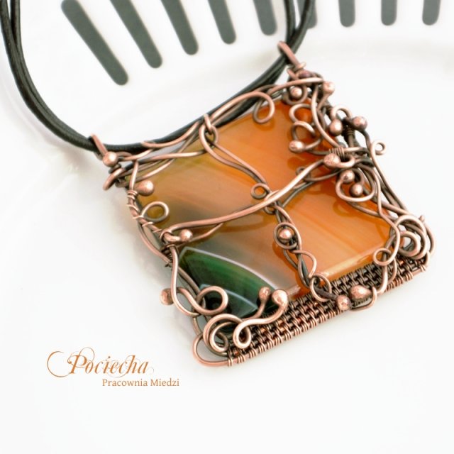 Wisior w formie okna ozdobiony pięknym agatem pawim w kolorach pomarańczu i zieleni.
