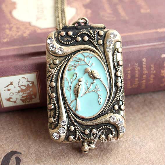 W błękitnej emalii zatopione urocze ptaszki na gałązce. Tył grawerowany.
