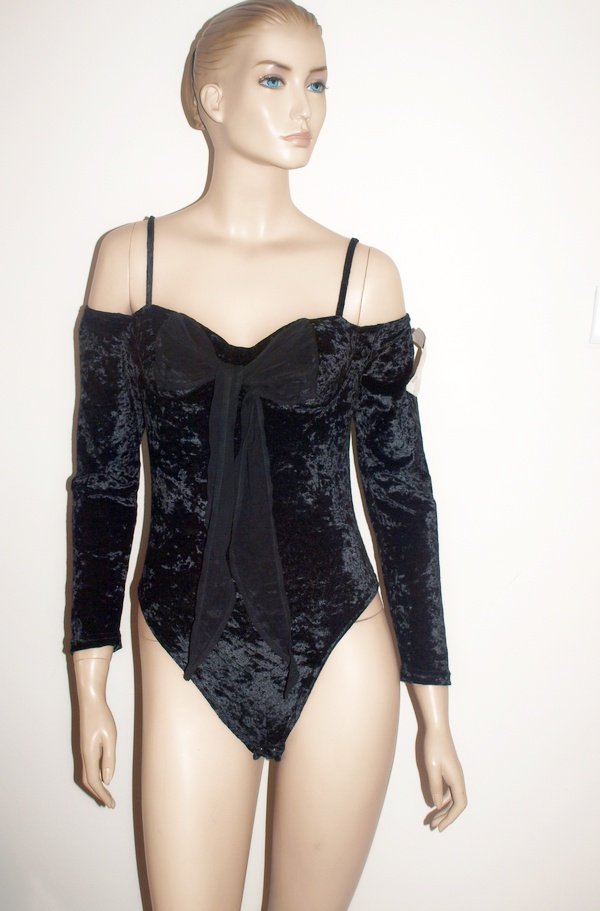 Body produkcji włoskiej, nowe z metką. Materiał welur 100% poliester.Miseczki usztywnione, ale nie na bardzo duży biust. Górą, także przez rękawki wszyta gumka. Ładnie wygląda zsunięte z ramion. Rozmiar z metki M, na manekinie o rozmiarze 38.