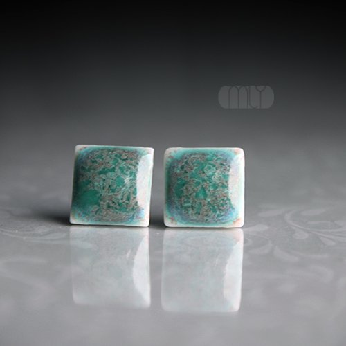 Ceramiczne kolczyki w formie sztyftów, ręcznie wykonane z porcelany, jednostronnie szkliwione mieszanką bladozielonego szkliwa, na sztyftach w kolorze srebrnym. Długość ok. 11mm. Polecam