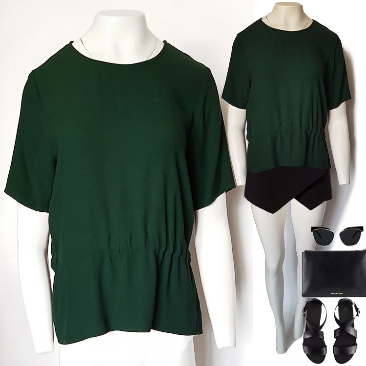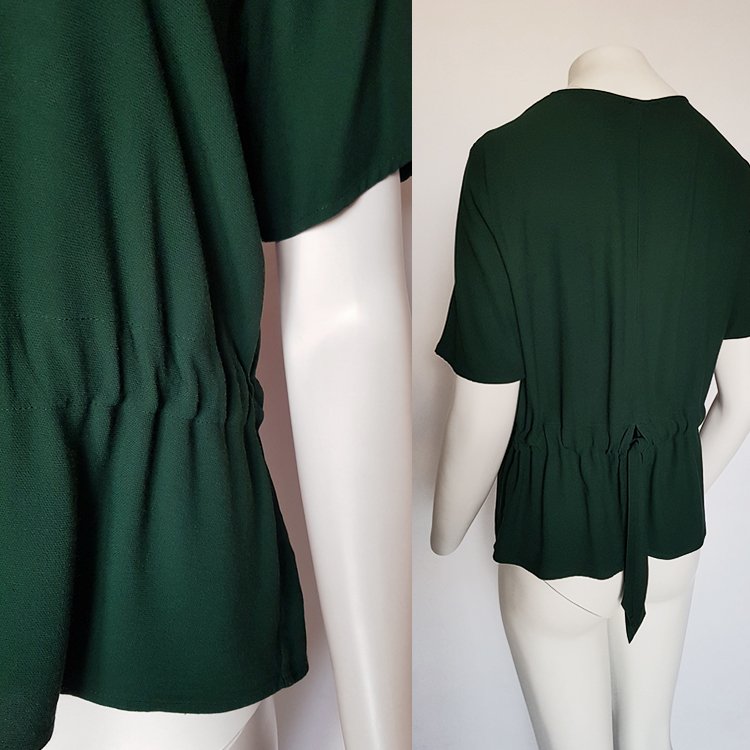Bluzka z lejącej, przewiewnej tkaniny wiskozowej w kolorze nasyconej zieleni. W pasie tunel z paskiem dającym możliwość regulacji oraz uzyskania ozdobnego marszczenia. Piękna minimalistyczna propozycja świetnie odnajdzie się zarówno w zestawieniach formalnych jak i nieformalnych.