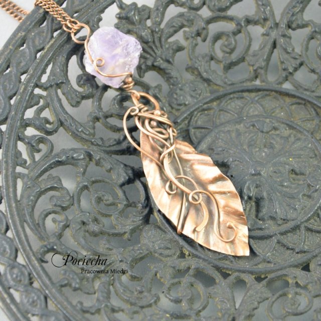Stworzyłam go z miedzi i surowej bryłki kwarcu o fioletowej fioletowej barwie . Liść wycięłam i uformowałam ręcznie z blachy.