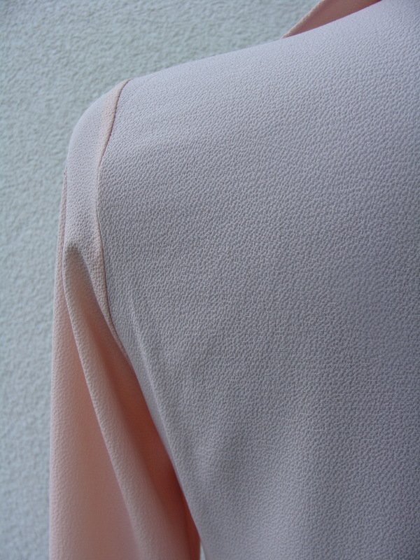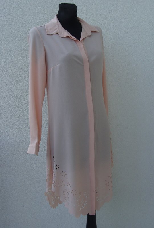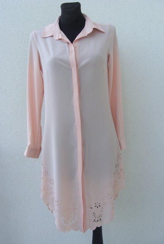 Ciekawa koszulowa sukienka z poliestrowej tkaniny w rozbielonym brzoskwiniowym kolorze, z chropowatą fakturą , u dołu laserowe wycinanki. Z kołnierzykiem , z krytym zapięciem na całej długości na małe guziczki. Asymetryczna - krótsza po bokach , zaokrąglona dołem. Dużo ładniejsza w realu.