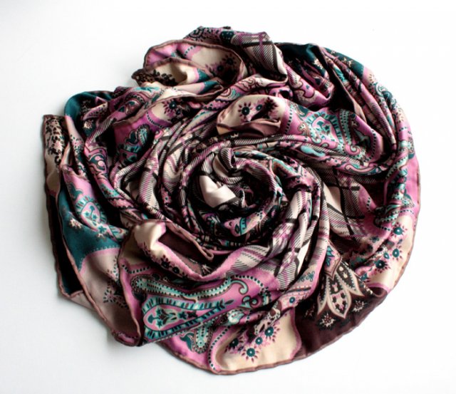 Przedstawiam Państwu wspaniałą chustę we wzory marki Senteur. Brak metki ze składem materiałowym. Moim zdaniem jest to elegancki, delikatny jedwab. Rolowane brzegi.