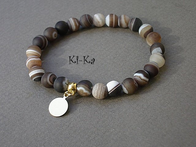 Bransoletka wykonana z kamieni półszlachetnych -trawione agaty [8mm] oraz elementów w kolorze złotym w tym zawieszka z mosiądzu . Pasuje na nadgarstek 15-16,5 cm. Bransoletka na gumce silikonowej. Biżuteria ozdobnie zapakowana. Bransoletka może stanowić komplet z innymi - przykładowe zdjęcia. Prace datowane.