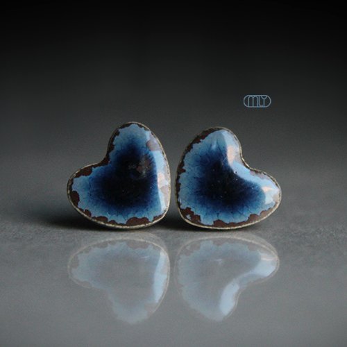 Ceramiczne kolczyki w formie sztyftów, ręcznie wykonane z delikatnej gliny kamionkowej, jednostronnie szkliwione mieszanką szaro błękitnych szkliw z efektem plamek i subtelnym połyskiem, na antyalergicznych sztyftach w kolorze srebrnym.Średnica ok. 12mm.. Polecam