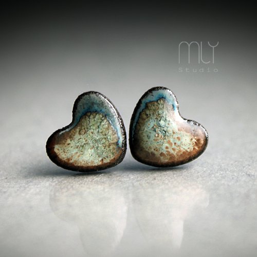 Ceramiczne kolczyki w formie sztyftów, ręcznie wykonane z delikatnej gliny kamionkowej, jednostronnie szkliwione mieszanką szarobrunatnych szkliw z efektem plamek i subtelnym połyskiem, na antyalergicznych sztyftach w kolorze srebrnym.Średnica ok. 12mm.. Polecam