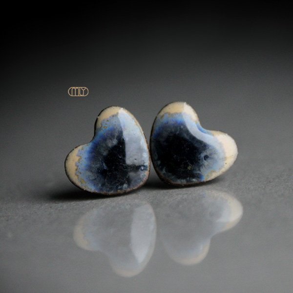 Ceramiczne kolczyki w formie sztyftów, ręcznie wykonane z delikatnej gliny kamionkowej, jednostronnie szkliwione mieszanką żółtych i szarych szkliw z efektem plamek i subtelnym połyskiem, na antyalergicznych sztyftach w kolorze srebrnym.Średnica ok. 12mm.. Polecam