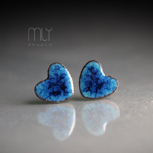 Ceramiczne kolczyki w formie sztyftów, ręcznie wykonane z delikatnej gliny kamionkowej, jednostronnie szkliwione mieszanką błękitnych szkliw z efektem plamek i subtelnym połyskiem, na antyalergicznych sztyftach w kolorze srebrnym.Średnica ok. 12mm.. Polecam