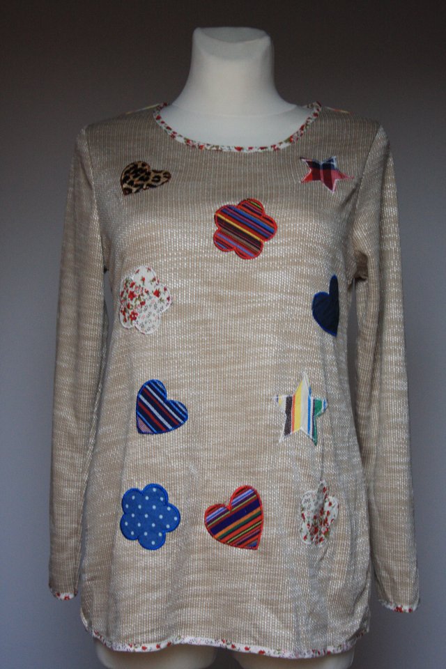 oryginalna dłuższa cienka bluzka w kolorze beżowym z naszytymi kolorowymi kwiatkami, sercami i gwiazdkami, brzegi wykończone materiałem w kwiaty, na plecach ozdobne paski, materiał miły w dotyku, brak metki ze składem