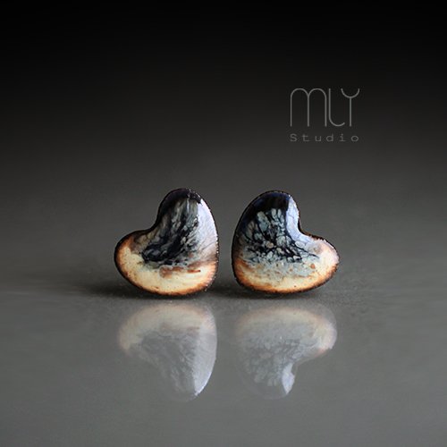 Ceramiczne kolczyki w formie sztyftów, ręcznie wykonane z delikatnej czekoladowobrązowej gliny kamionkowej, jednostronnie szkliwione mieszanką beżowo szarych szkliw z efektem plamek, na antyalergicznych sztyftach w kolorze srebrnym. Średnica ok. 12mm. Polecam