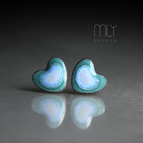 Ceramiczne kolczyki w formie sztyftów, ręcznie wykonane z delikatnej gliny kamionkowej, jednostronnie szkliwione mieszanką biało błękitnych i zielonych szkliw z efektem plamek i subtelnym połyskiem, na antyalergicznych sztyftach w kolorze srebrnym.Średnica ok. 12mm.. Polecam