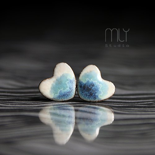 Ceramiczne kolczyki w formie sztyftów, ręcznie wykonane z delikatnej gliny kamionkowej, jednostronnie szkliwione mieszanką biało błękitnych i białopełowych szkliw z efektem plamek i subtelnym połyskiem, na antyalergicznych sztyftach w kolorze srebrnym.Średnica ok. 12mm.. Polecam