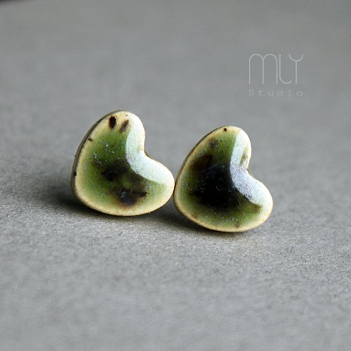 Ceramiczne kolczyki w formie sztyftów, ręcznie wykonane z delikatnej gliny kamionkowej, jednostronnie szkliwione mieszanką zielonych szkliw z efektem plamek i subtelnym połyskiem, na antyalergicznych sztyftach w kolorze srebrnym.Średnica ok. 12mm.. Polecam