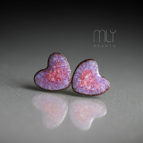 Ceramiczne kolczyki w formie sztyftów, ręcznie wykonane z delikatnej gliny kamionkowej, jednostronnie szkliwione mieszanką różowych szkliw z efektem plamek i subtelnym połyskiem, na antyalergicznych sztyftach w kolorze srebrnym.Średnica ok. 12mm.. Polecam