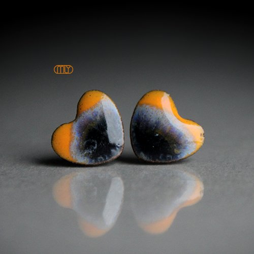 Ceramiczne kolczyki w formie sztyftów, ręcznie wykonane z delikatnej gliny kamionkowej, jednostronnie szkliwione mieszanką żółtych i szarych szkliw z efektem plamek i subtelnym połyskiem, na antyalergicznych sztyftach w kolorze srebrnym.Średnica ok. 12mm.. Polecam