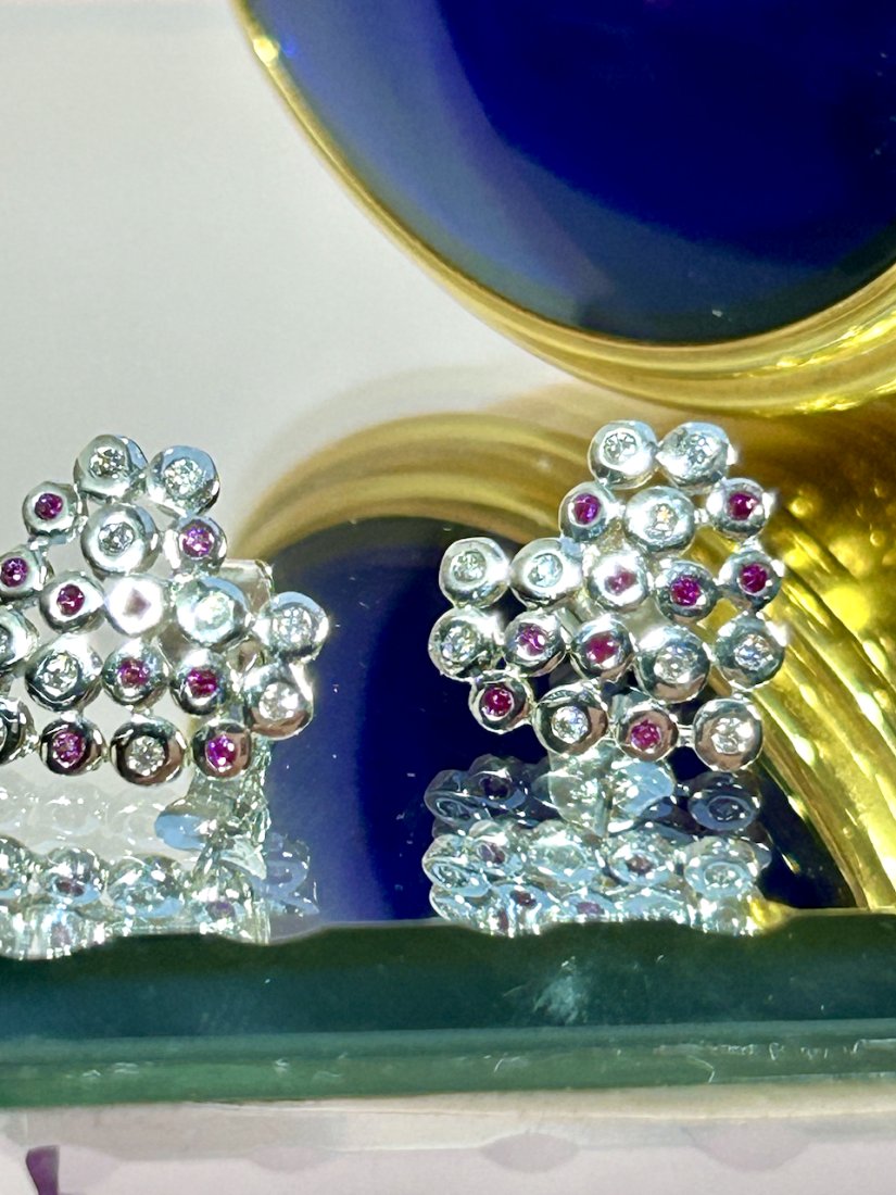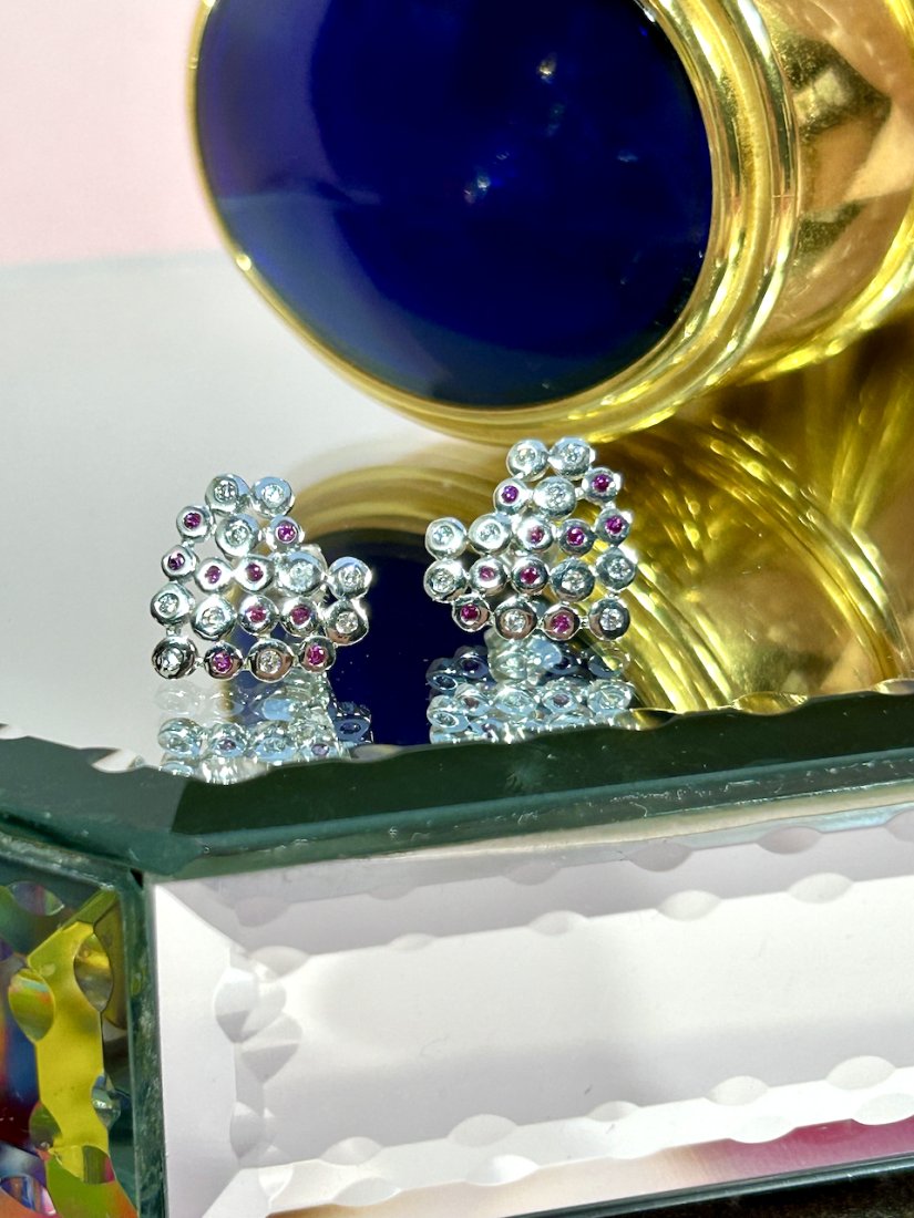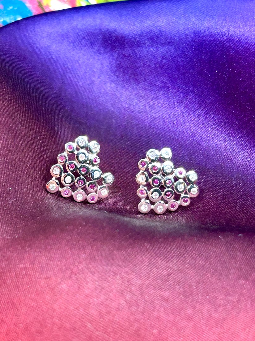 Srebrne lekko ażurowe serca z cudnymi oczkami w które oprawiono białe i rubinowe cyrkonie.