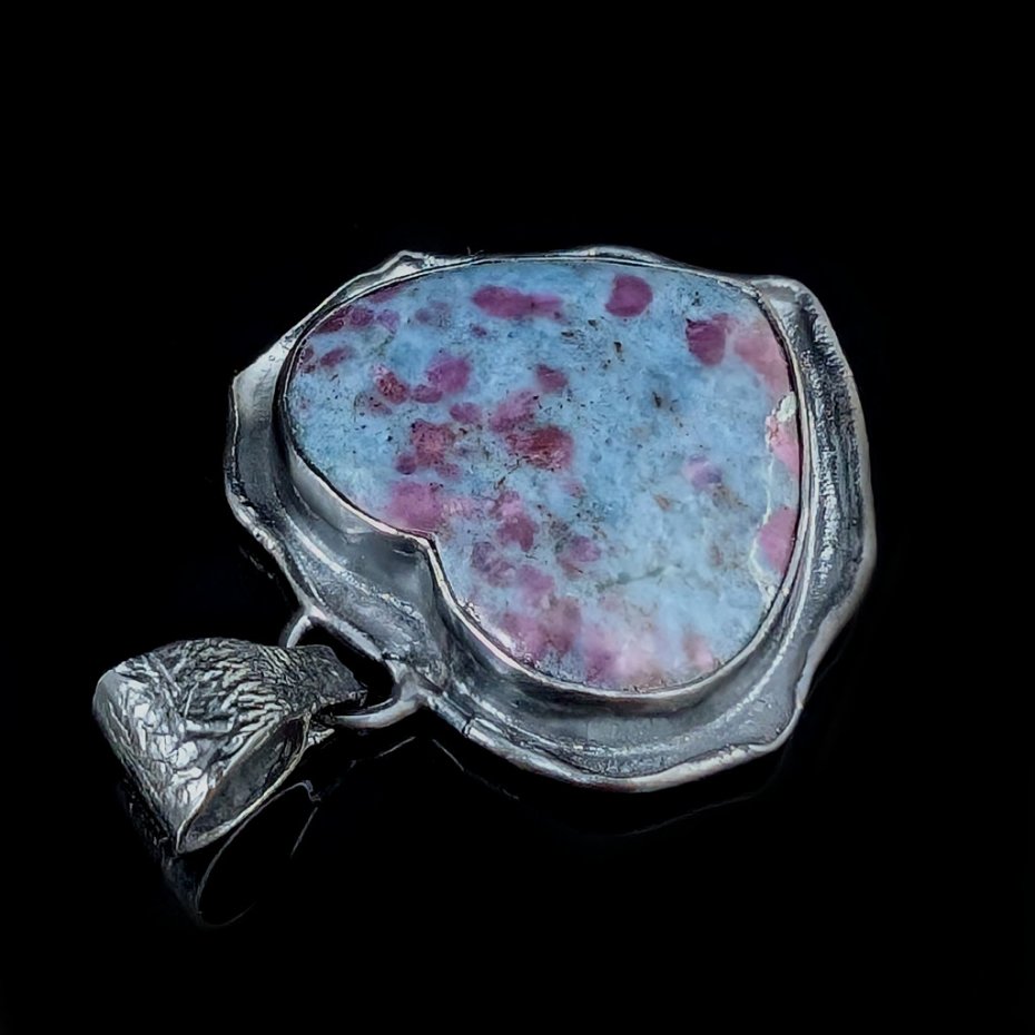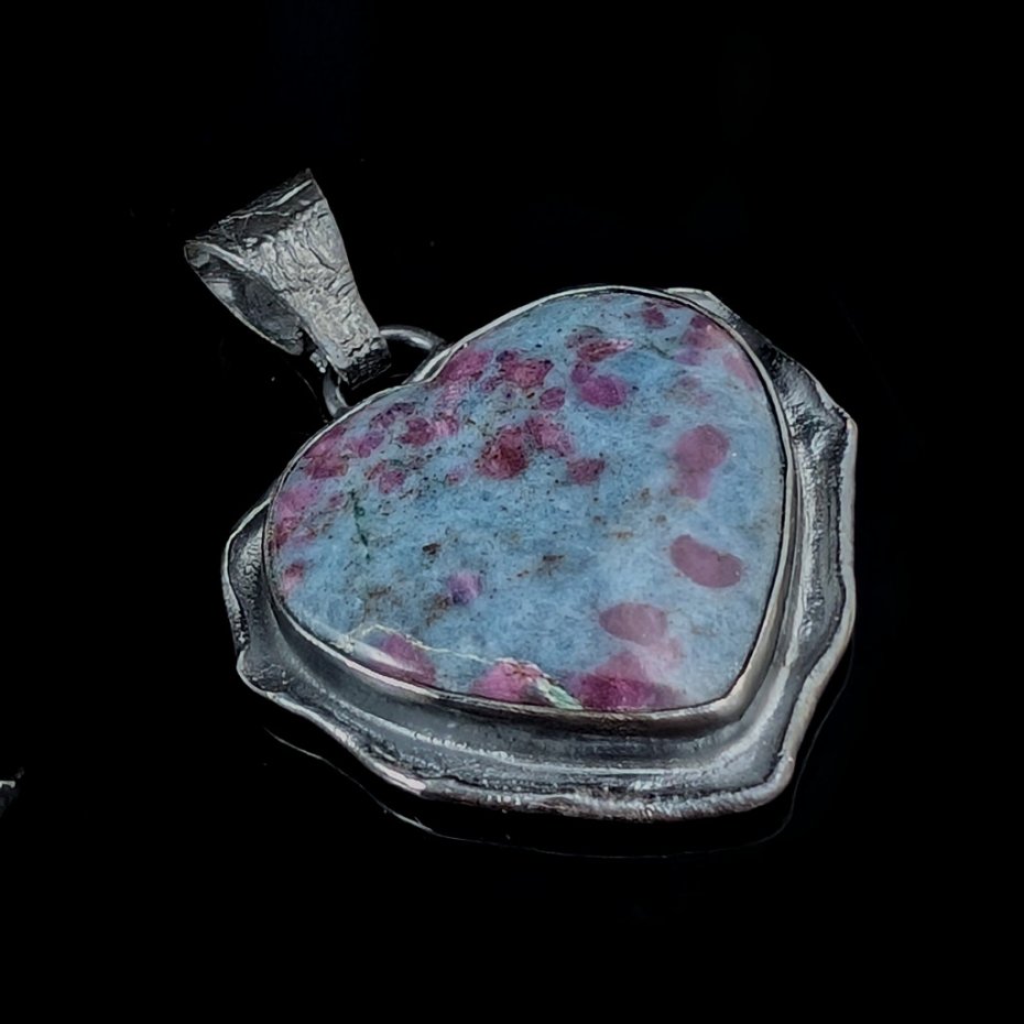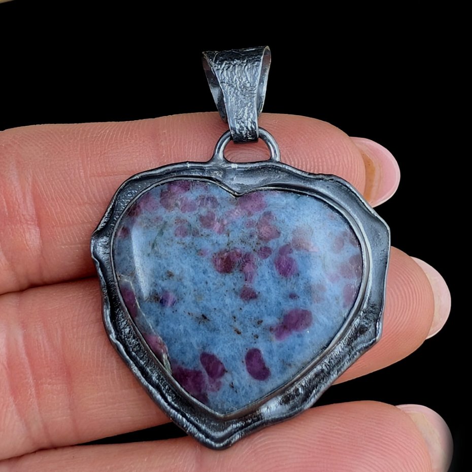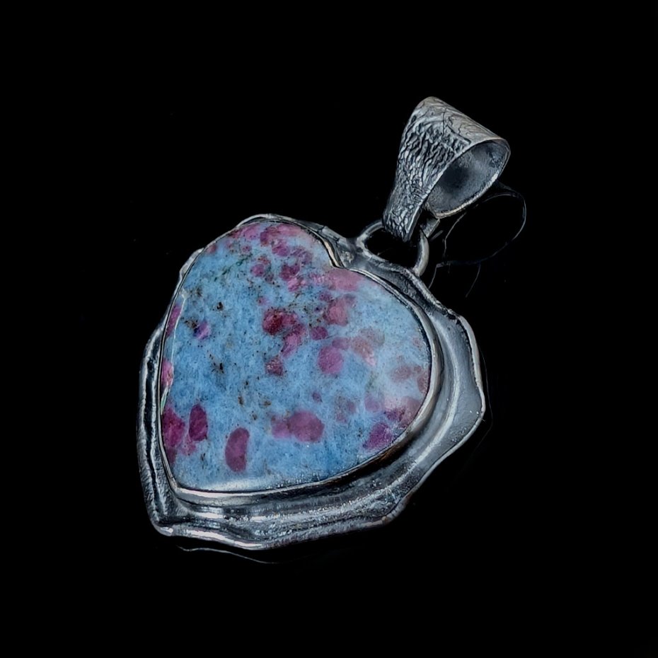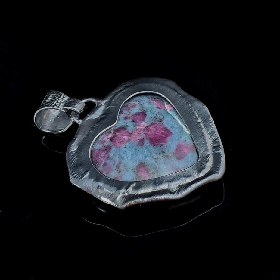 Piękny kyanit w kształcie serca z wrostami rubinów oprawiony w wisior z oksydowanego srebra próby 925. Wymiary oprawy serca 32 x 31 mm, długosć z krawatką 42 mm, waga 15 g. Tył wisiorka jest otwarty ukazując piękno kamienia w całej okazałości. Wisior zostanie wysłany w ozdobnym pudełeczku.