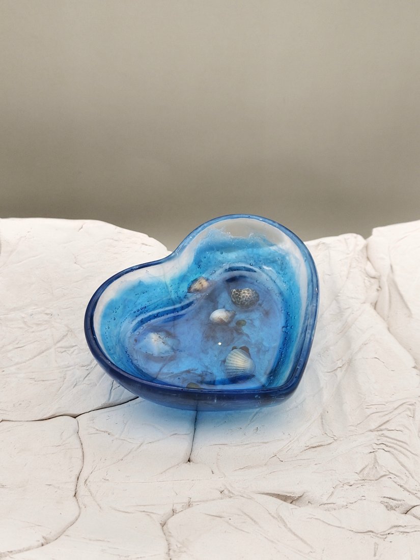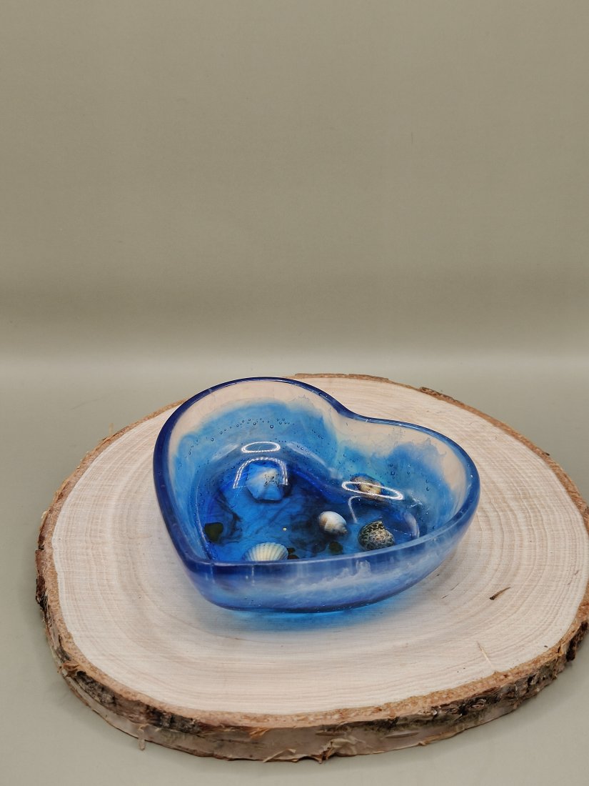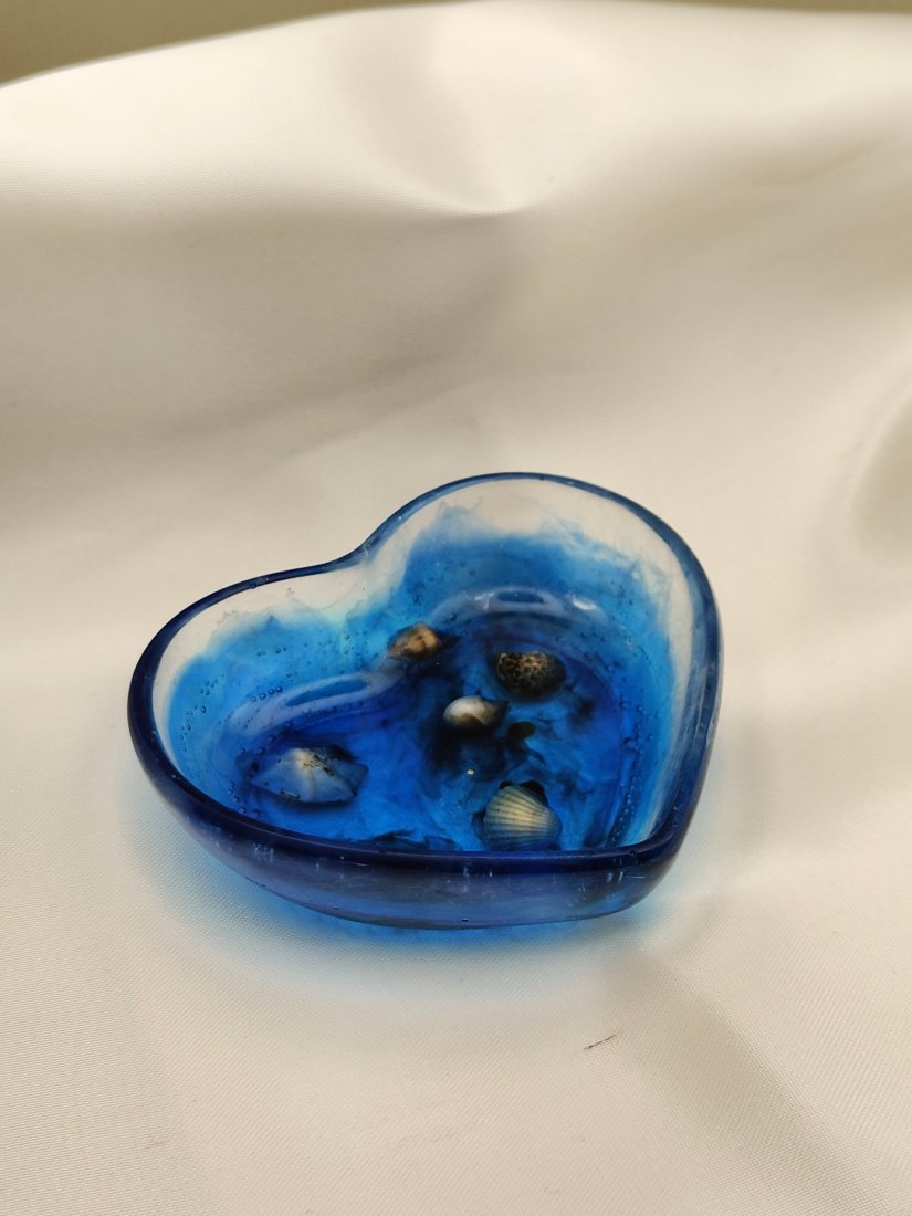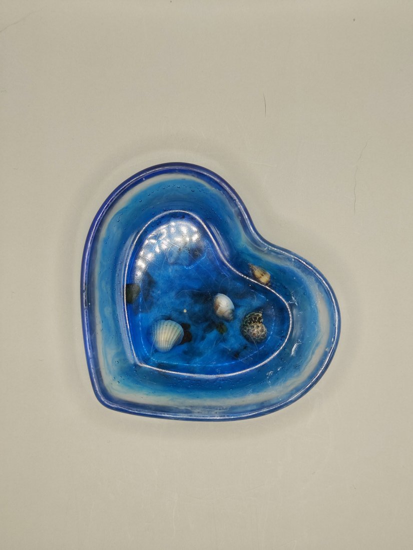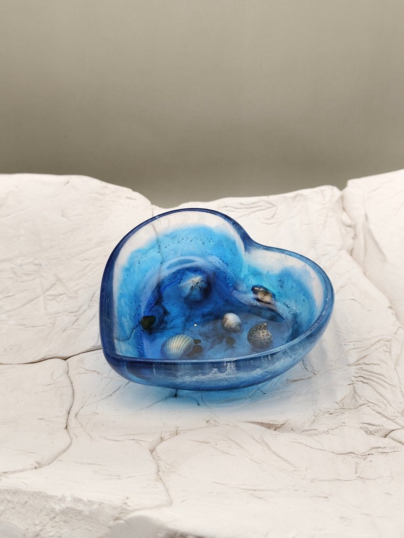 Unikatowy pojemnik wykonany ręcznie z transparentnej żywicy epoksydowej w kształcie serca. Wnętrze kompozycji przypomina miniaturowy fragment morskiej głębi – z falującymi niebieskimi przejściami kolorów oraz zatopionymi prawdziwymi muszelkami. To dekoracyjny przedmiot, który przyciąga wzrok i wprowadza do wnętrza subtelny, nadmorski klimat. Idealny jako miseczka na drobiazgi, biżuterię, klucze lub po prostu jako ozdoba.
