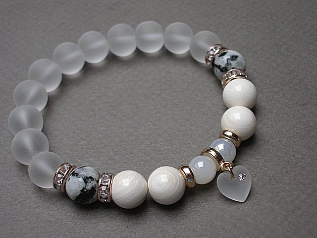 PROJEKTY AUTORSKIE.KOPIOWANIE ZABRONIONE. Bransoletka wykonana z kuleczek muszli ecru [10mm] ,kuleczek kamienia księżycowego [10mm] ,szklanych matowych kuleczek [10mm] ,szklanych opalizujących kuleczek [8mm] ,zawieszki serca kryształka Swarovskiego [10mm] oraz elementów w kolorze różowego złota. Bransoletka pasuje na nadgarstek 16-17cm. Bizuteria ozdobnie zapakowana.