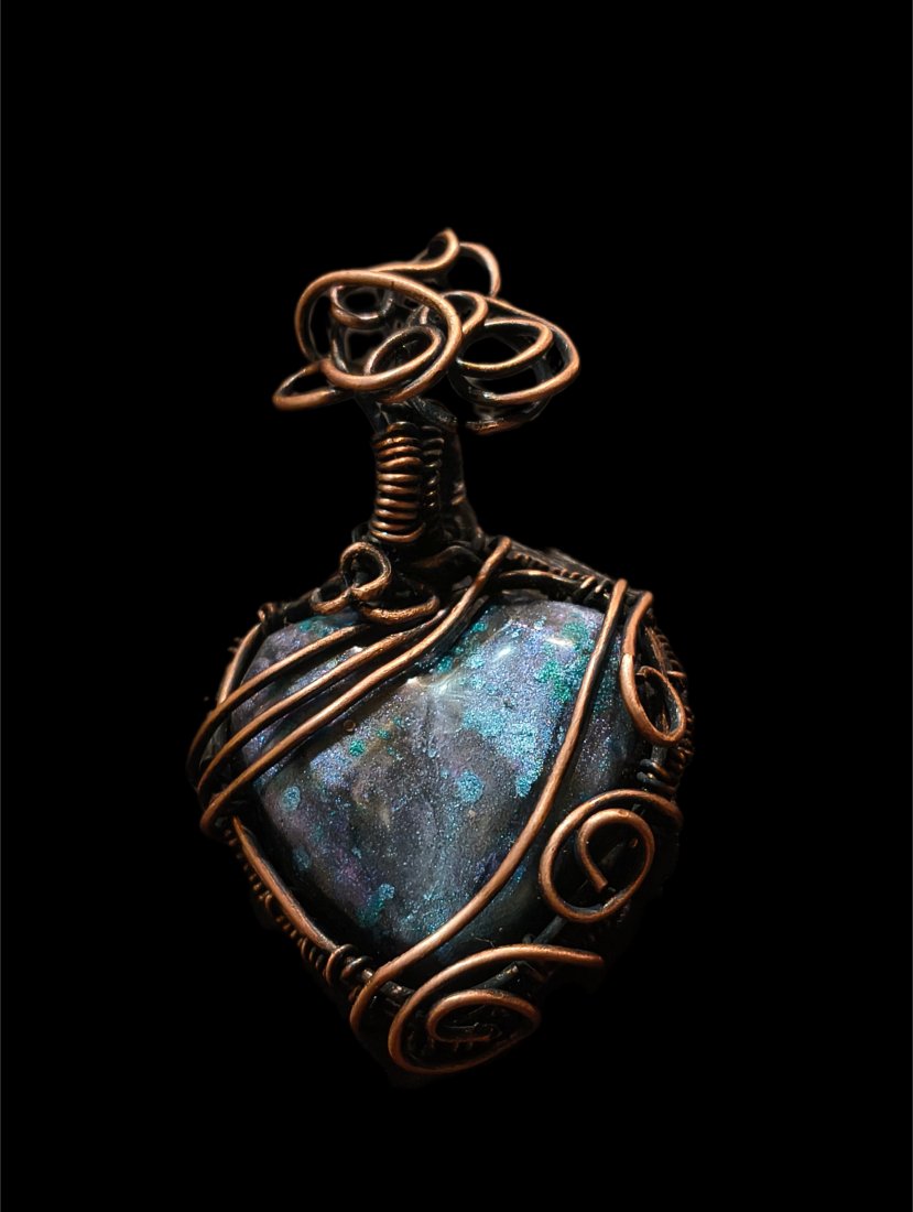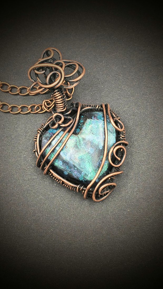 Miedziany wisiorek oksydowany wykonany techniką Wire Wrapping z autorskim kamieniem z żywicy epoksydowej