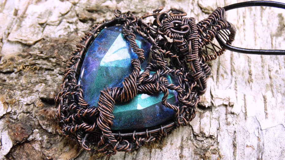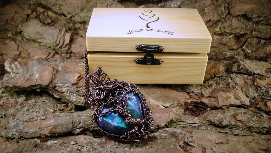 Miedziany wisiorek oksydowany wykonany techniką Wire Wrapping z autorskim kamieniem z żywicy w drewnianym pudełku